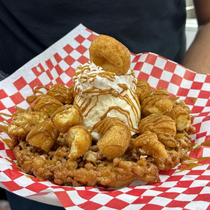 Fuunel cake con azúcar glass, glaseado clásico, plátano, nieve de vainilla, crema batida, galleta oreo triturada y nutella