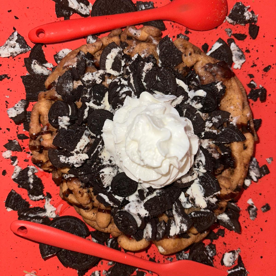 Fuunel cake con azúcar glass, glaseado clásico, fresa, nieve de vainilla, crema batida, galleta oreo triturada y nutella