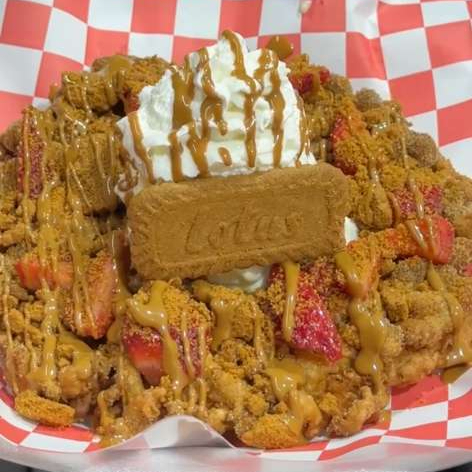 Funnel cake con azúcar glass, gláseado biscoff lotus, fresa, nieve de vainilla, crema batida, galleta biscoff lotus triturada y endulzante biscoff lotus