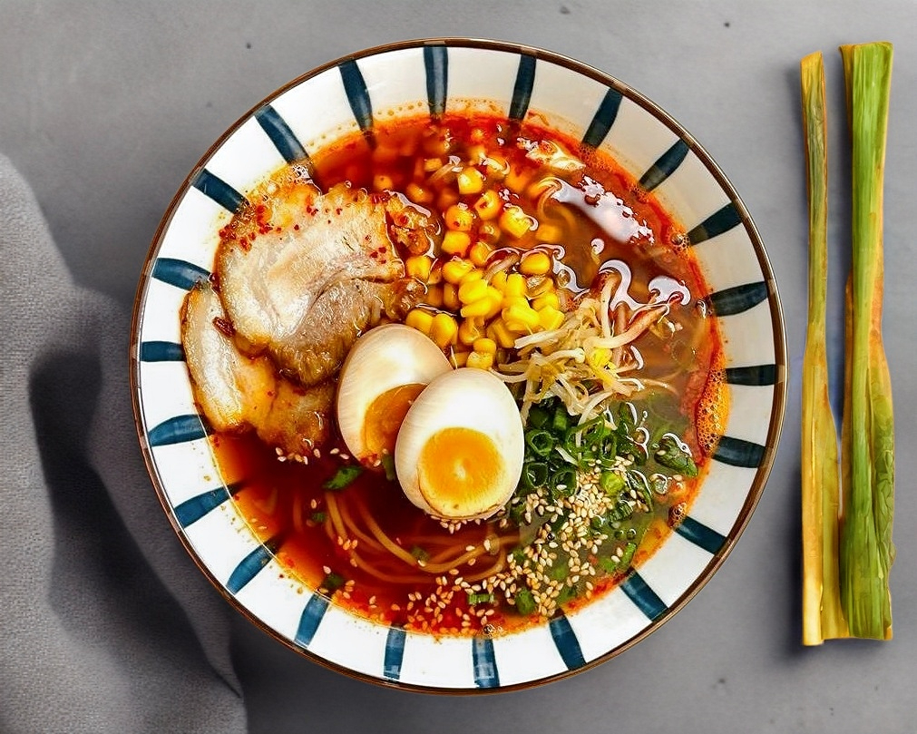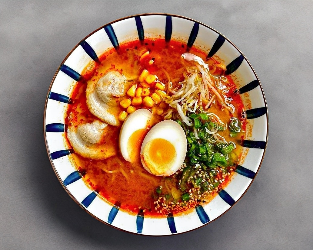 Caldo de pollo con miso y pure de chiles coreanos, fideos de ramen, verduras, huevo cocido y carne de puerco.