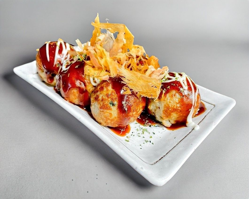 Bolitas de harina de trigo con caldo de pescado, rellenas de pulpo, cebollín y jengibre. Bañadas en salsa para tokoyaki, mayonesa y hojuelas de bonito.