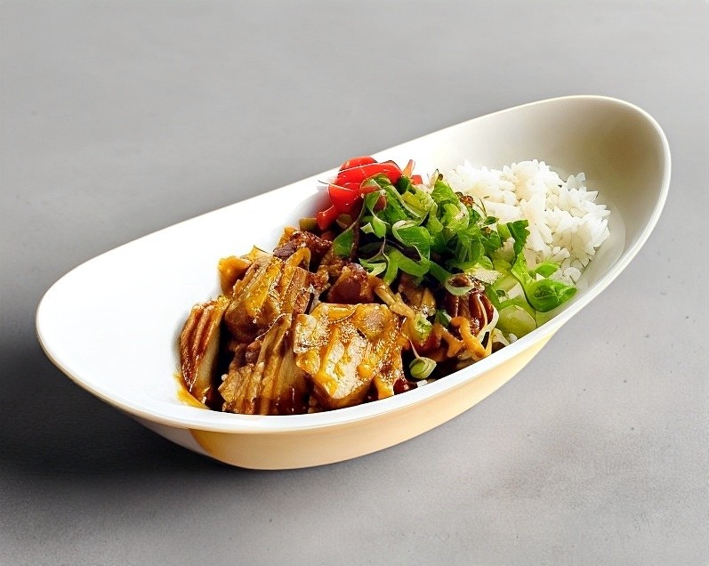 Carne de puerco en salsa teriyaki sobre una cama de arroz blanco, acompañado de repollo, cebollin, ajonjoli y mayonesa chipotle