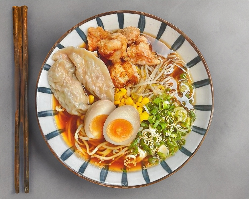 Shoyu ramen con pollo frito, wonton, verduras y huevo cocido.