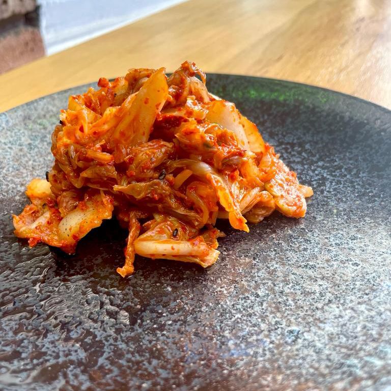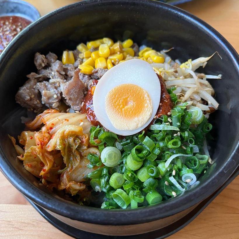 Kimchi con carne de res, chop suey, elote, cebollín y huevo cocido, lleva ajonjolí, salsa coreana en cama de arroz.