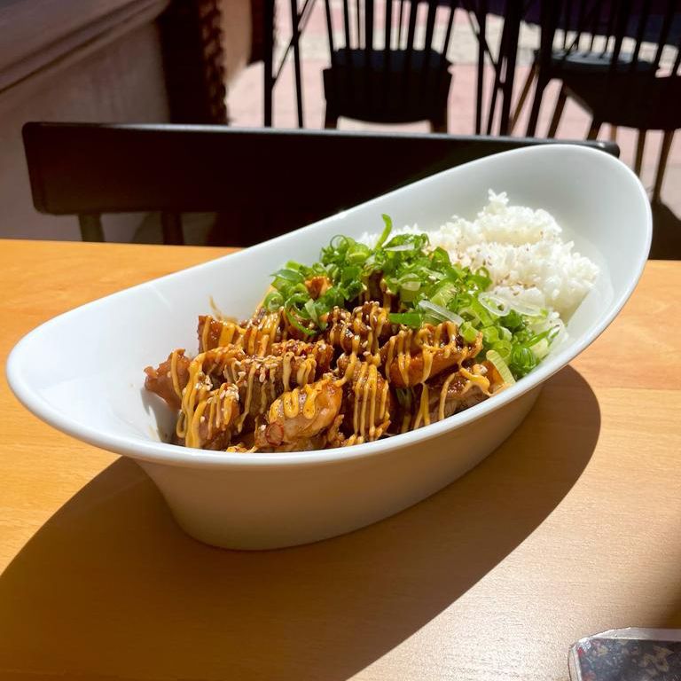 Pollo bañado en salsa Teriyaki con hojuelas de chile, sobre cama de arroz blanco, acompañado de repollo, cebollin, ajonjoli y mayonesa chipotle.