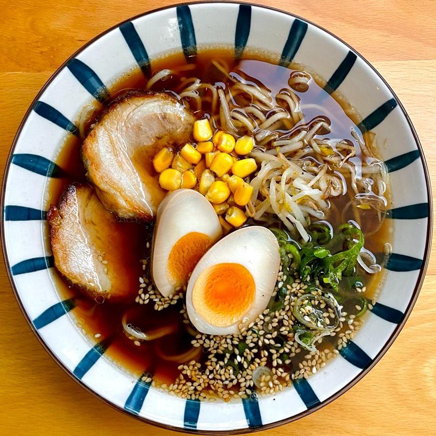 Shoyu ramen con curry japonés, cebollín, elote, huevo cocido y carne de puerco.