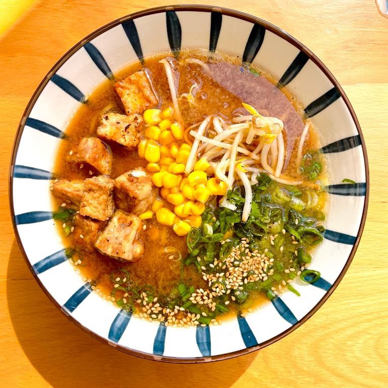 Miso Ramen con salsa de soya, tofu frito y verduras.