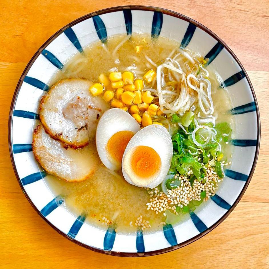 Ramen con caldo de cerdo, verduras, jengibre, huevo cocido y carne de cerdo.