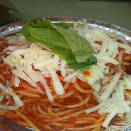 Espagueti, salsa a la boloñesa, salsita italiana, tocino y queso.