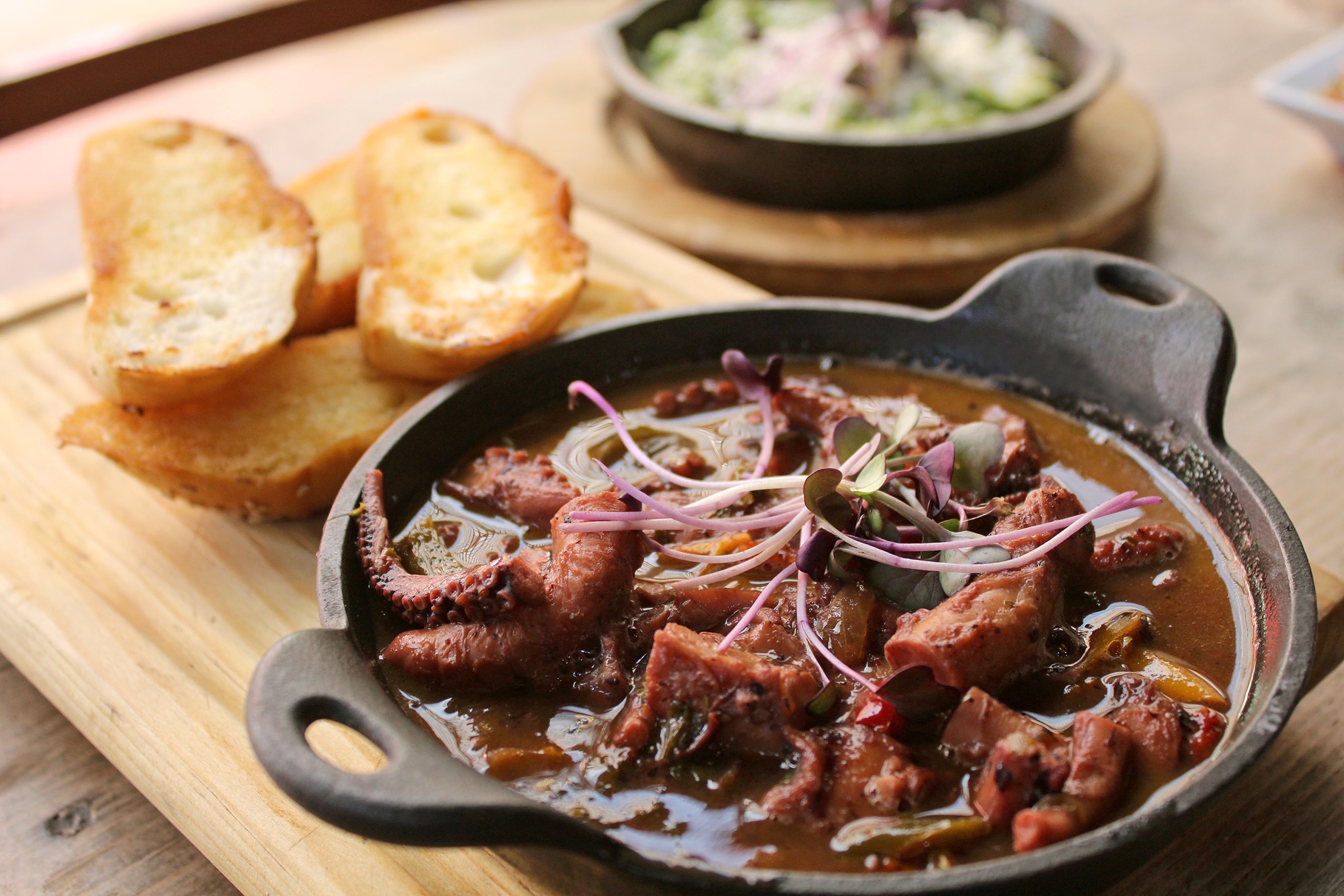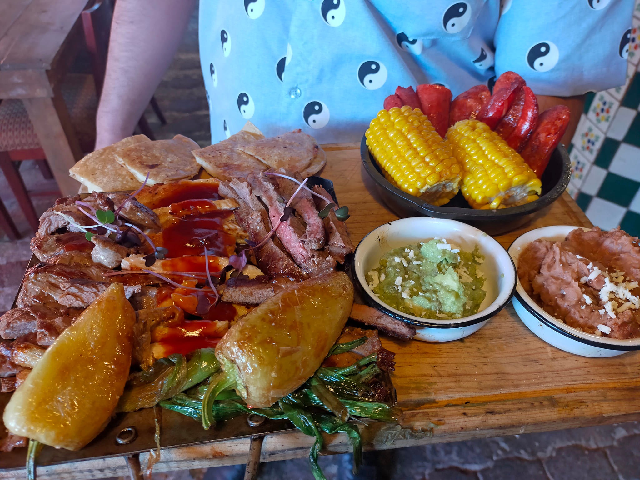 Arrachera, picana, chorizo, español, pollo BBQ, elote, frijoles, charros, cebollas asadas, guacamole y 4 quesadillas.
