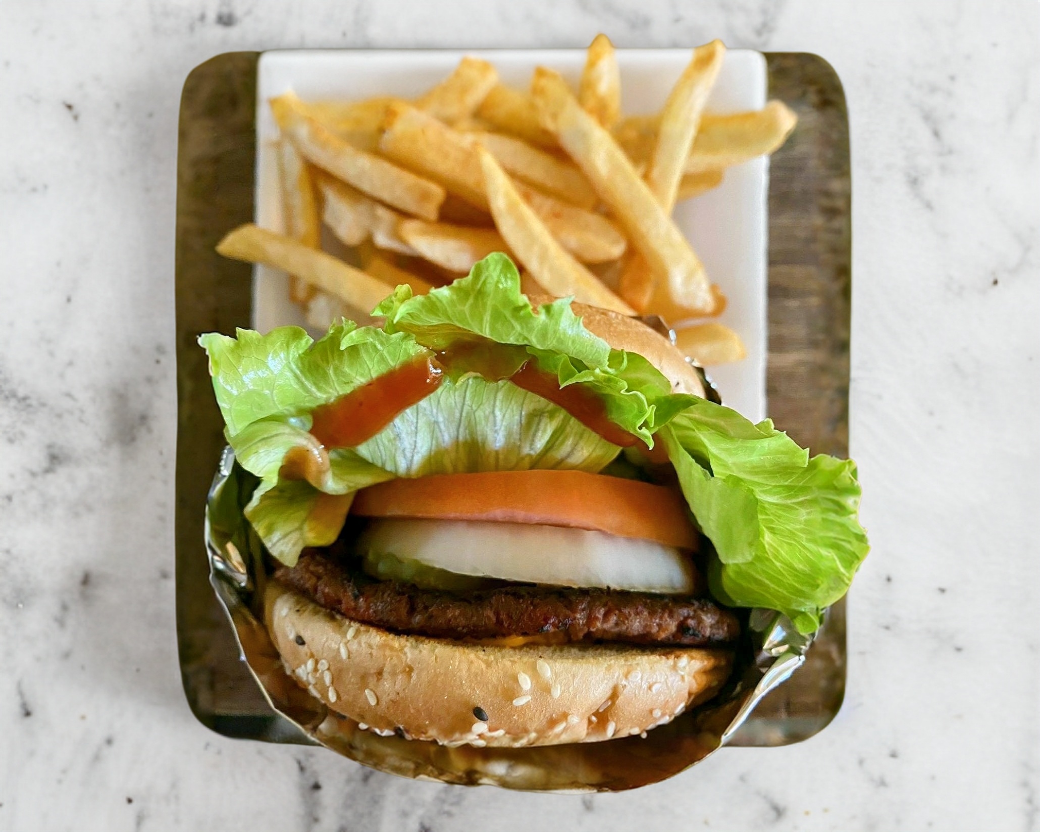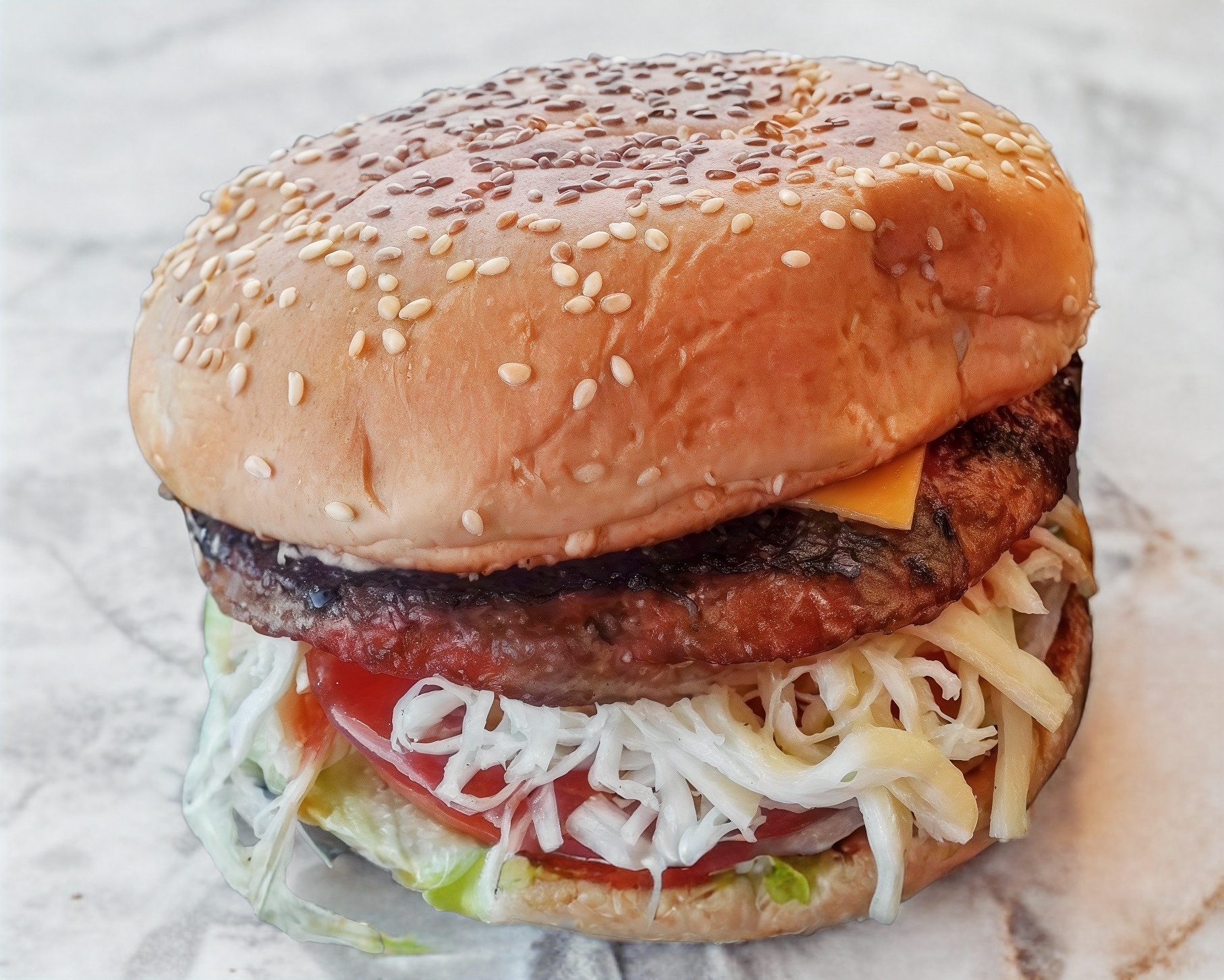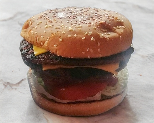 Contiene mayonesa, doble carne,doble queso amarillo, lechuga, tomate, cebolla, pepinillos catsup y mostaza