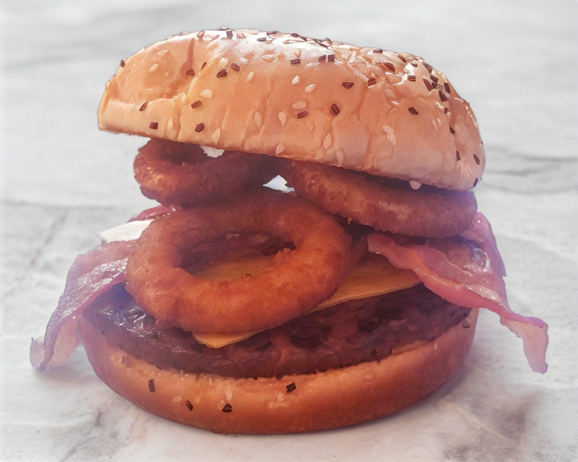 Pan, mayonesa, catsup, carne bañada con salsa BBQ, queso amarillo, tocino y aros de cebolla
