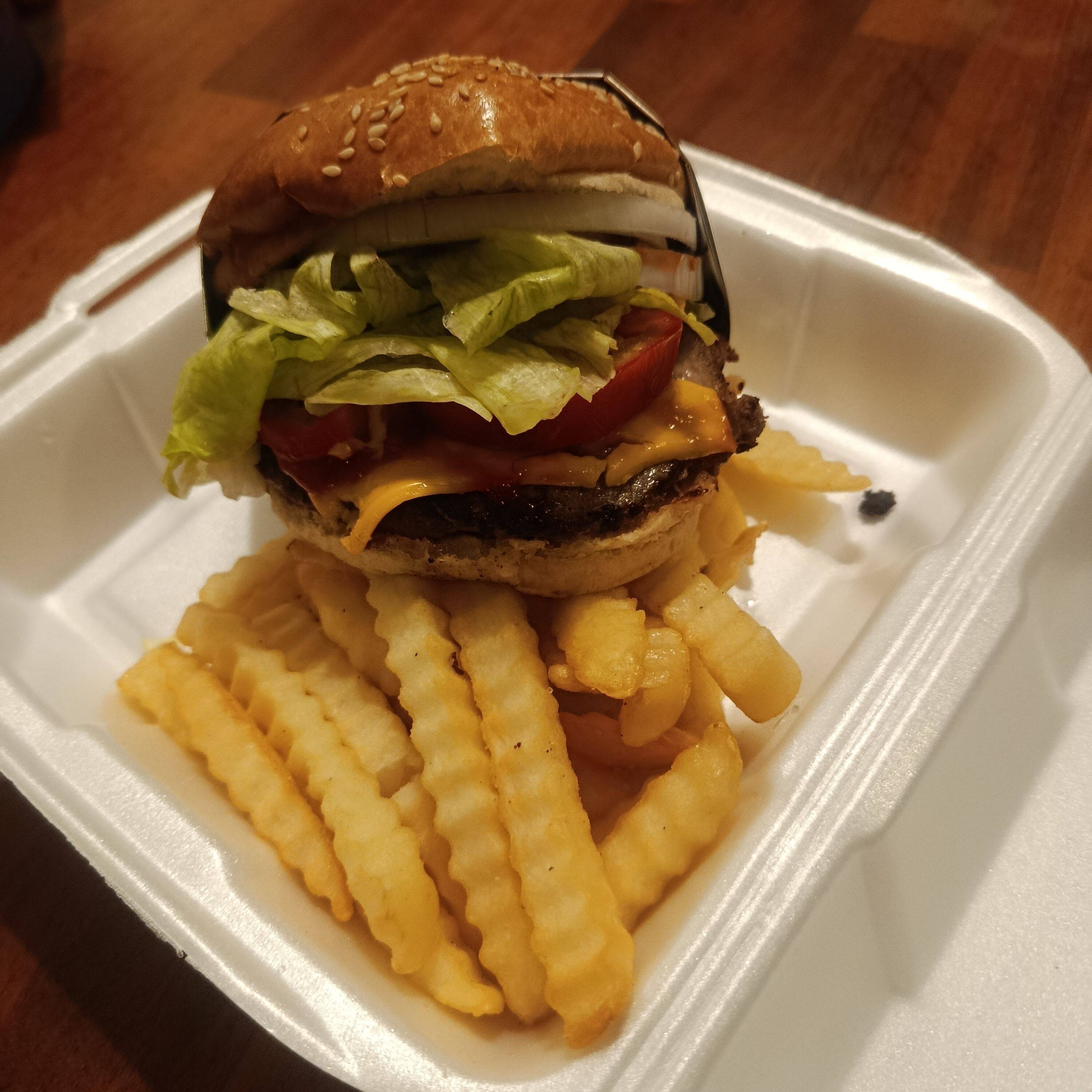 Carne de res, queso amarillo, lechuga tomate cebolla acompañado de papas