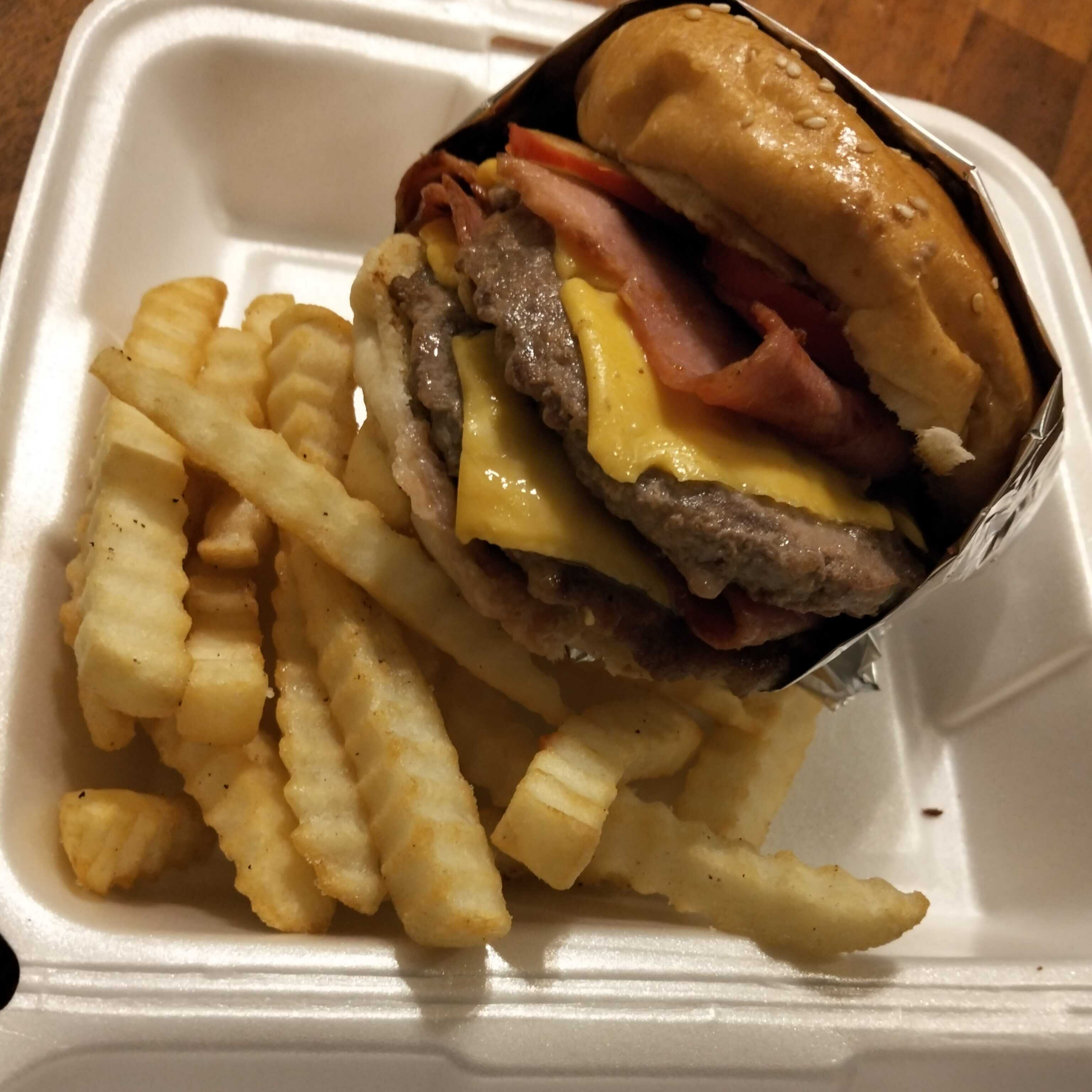 Dos carnes doble porción de tocino doble de queso acompañado de papas
