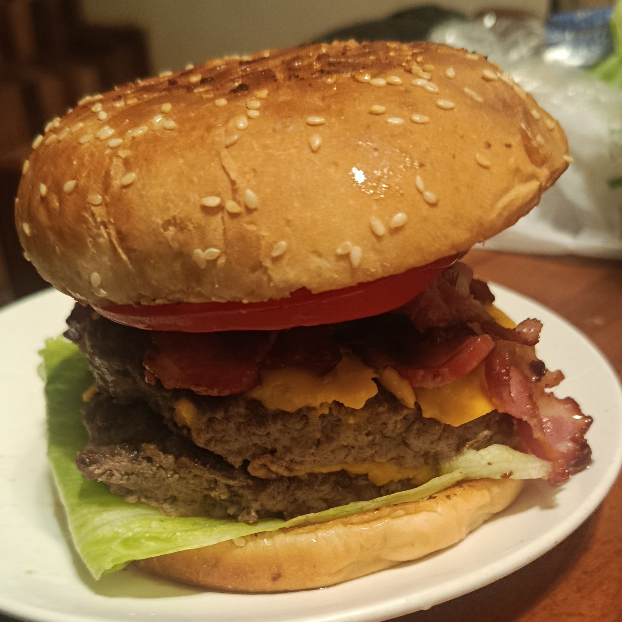Dos piezas de carne tocino en cada capa queso tomate cebolla lechuga