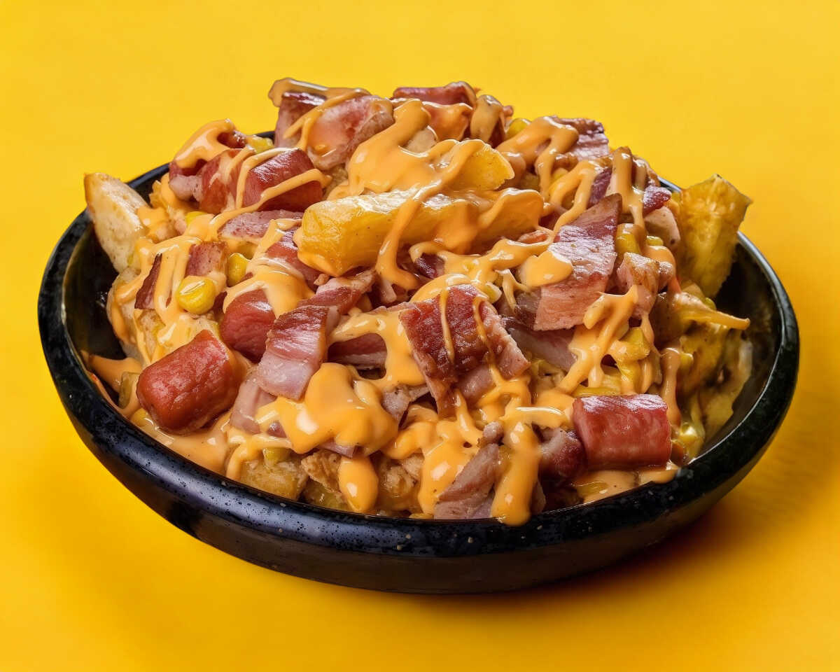 Papas fritas con queso para nachos, carne, tocino y salchicha