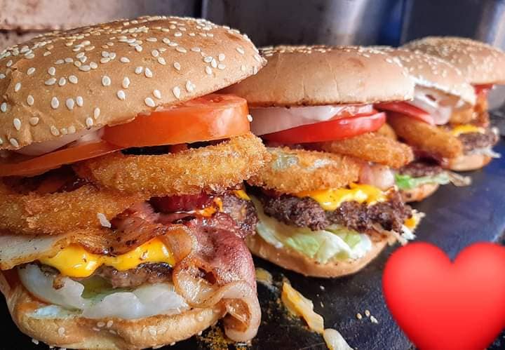 Pan artesanal, carne de pollo, queso amarillo, aros de cebolla, tocino, tomate, cebolla y salsa BBQ.