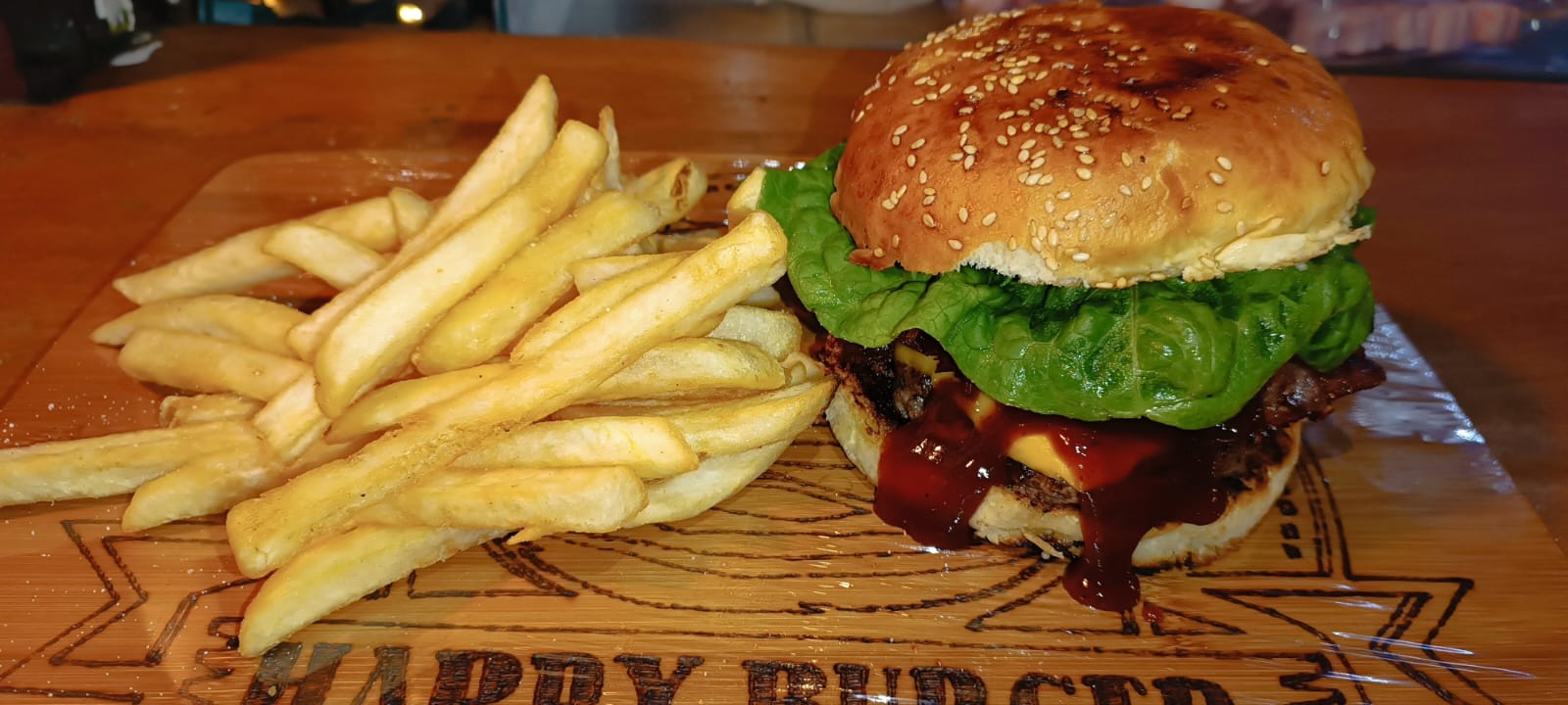 Pan artesanal, queso amarillo, aros de cebolla, tocino, salsa BBQ, lechuga