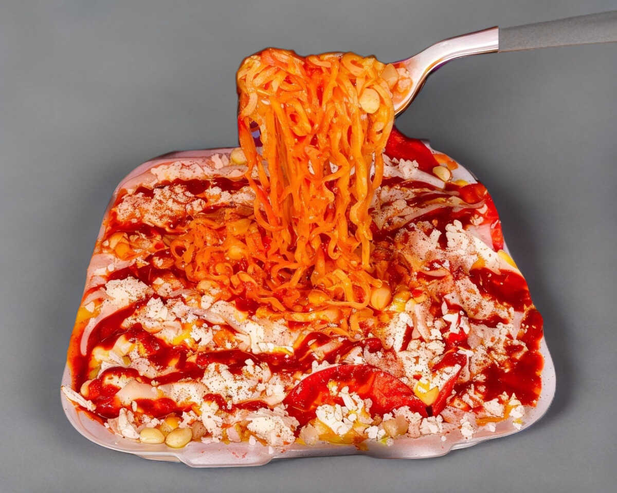 Sopa sin caldito, en cama de papitas, elote desgranado, queso blanco y de nachos, mayonesa, mantequilla.