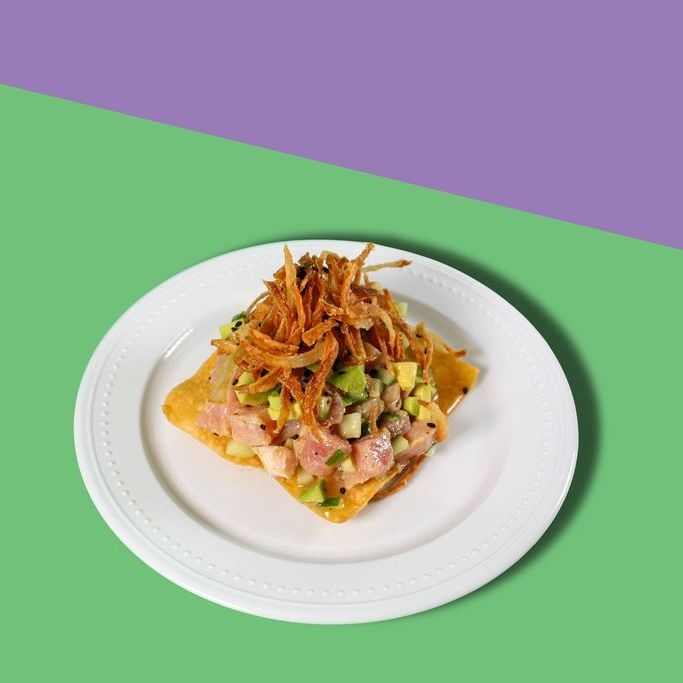 Medallón de atún fresco en cubos con pepino y aguacate bañado en salsa ponzu con un toque de aceite de ajonjolí. Sobre una tostada de wonton decorado con ajonjolí negro cebollín y cebolla crujiente.