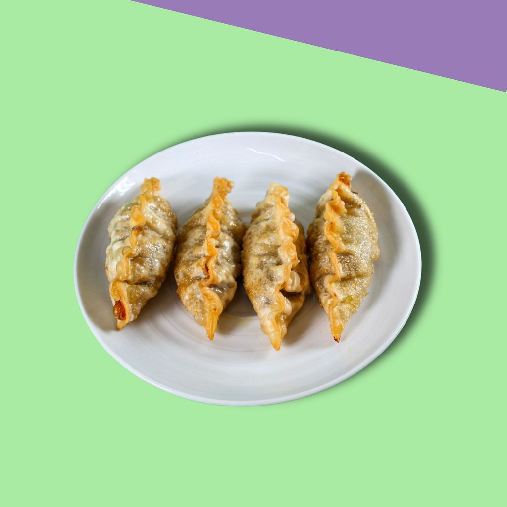 4 gyozas doraditas en aceite de ajonjolí, bañadas en salsa soya.