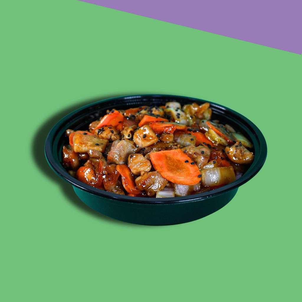 Trozos de pollo a la plancha cebolla y zanahoria bañados en salsa teriyaki sobre una cama de arroz blanco. Servido con una porción de ensalada de pepino.