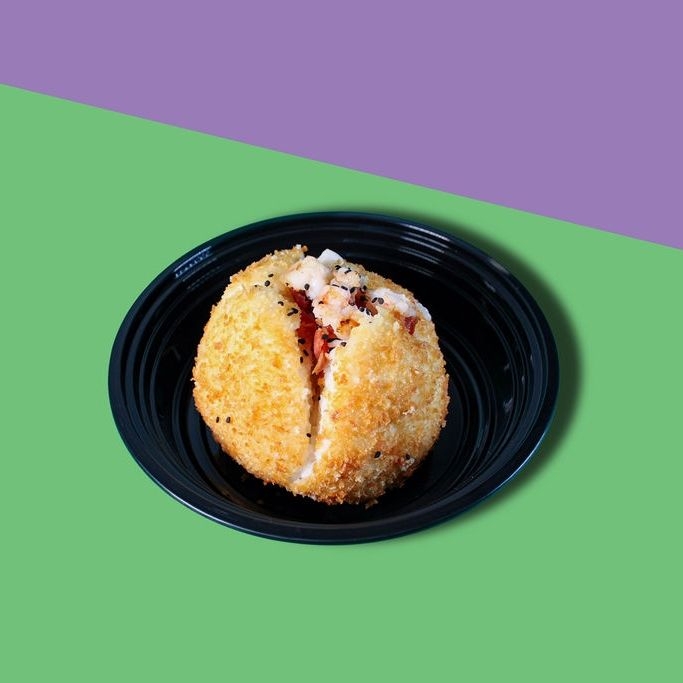 Bola de arroz empanizada en panko y frita con relleno salsas y toppings de tu elección. Pídelo con cebollín y ajonjolí negro.