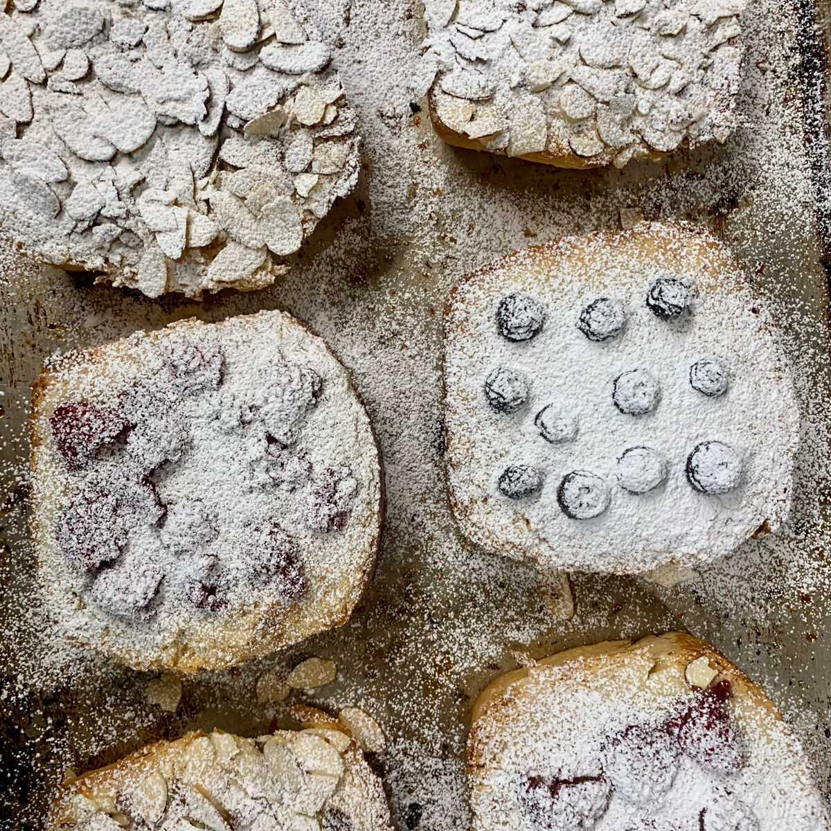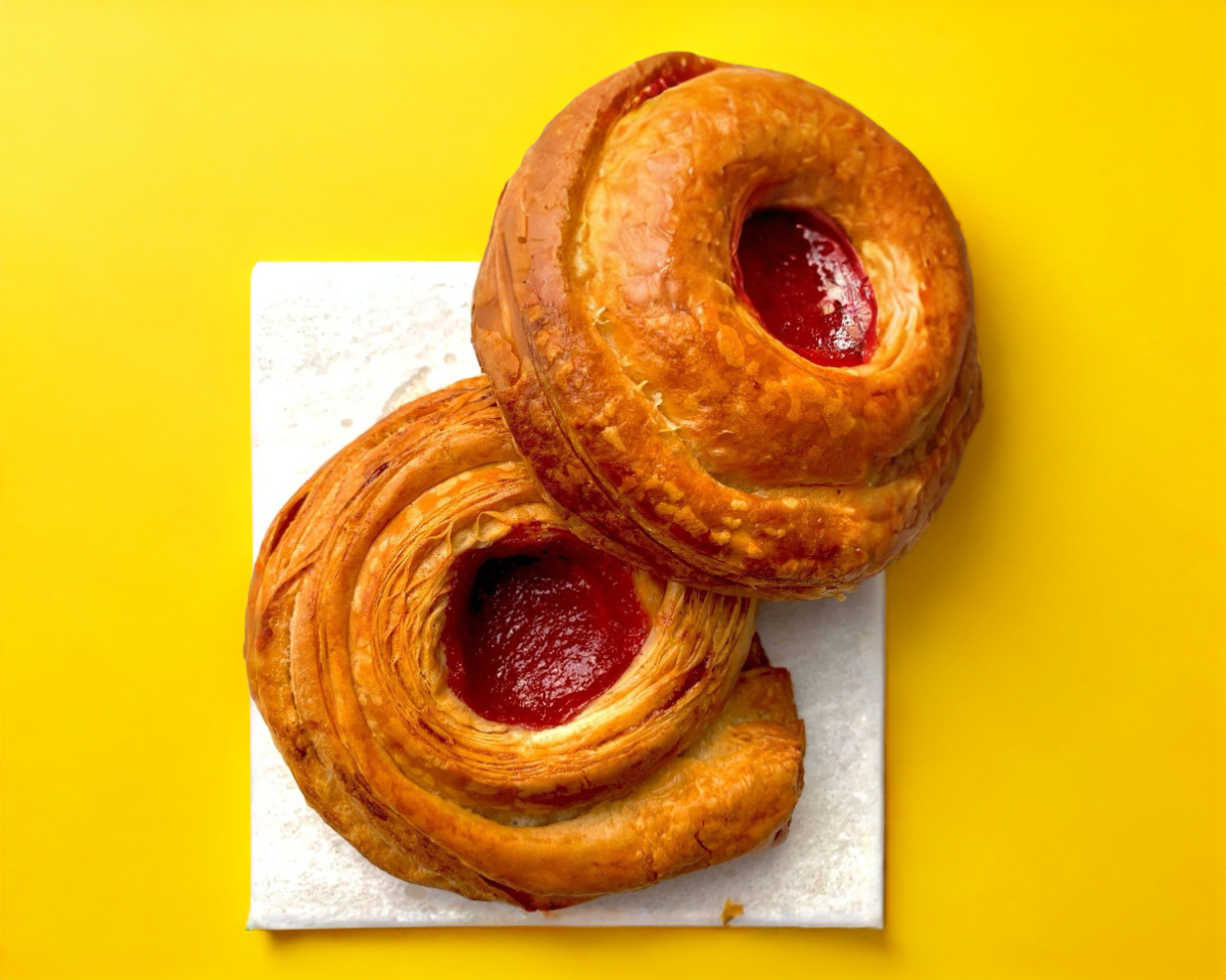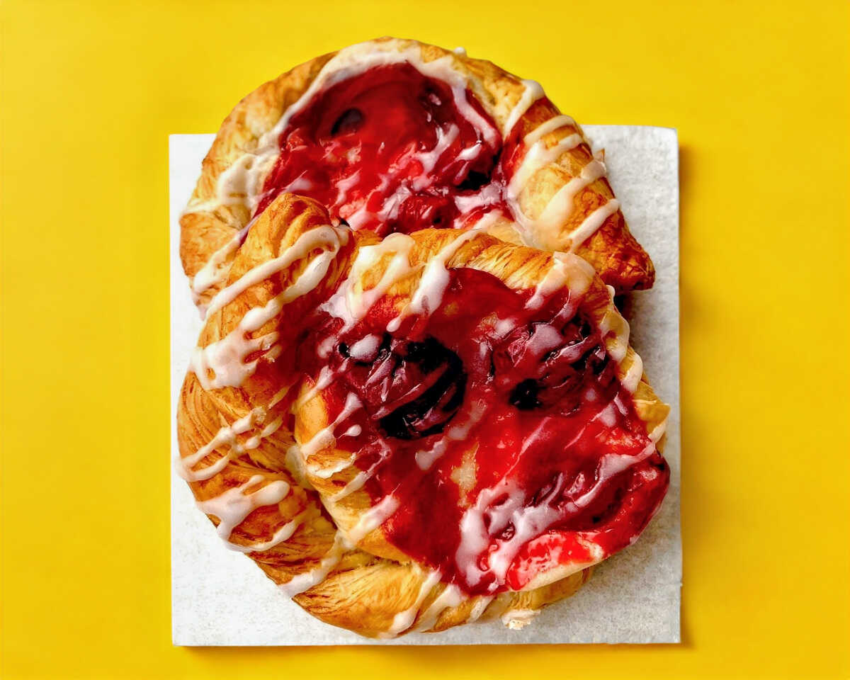 Panecillo francés. Capas de masa madre, mantequilla, queso crema y cerezas..