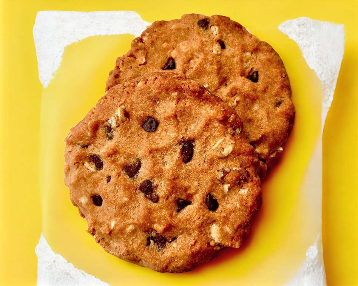 Galleta de chispas de chocolate, avena y crema de cacahuate.