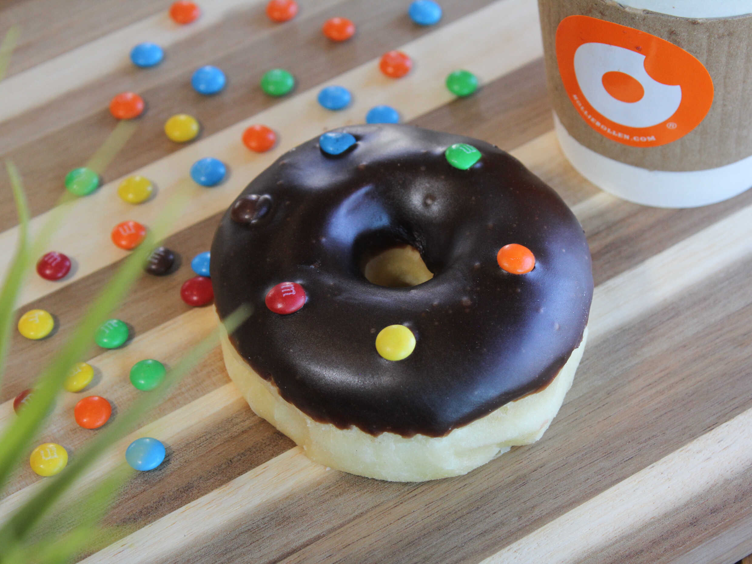 Hollieböllen recién elaborada, con cobertura de chocolate y m&ms, la dona favorita de todos los que tenemos alma de niños :D