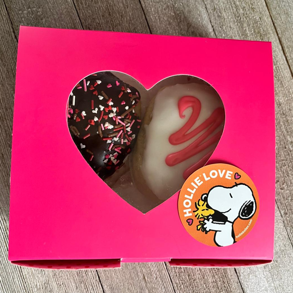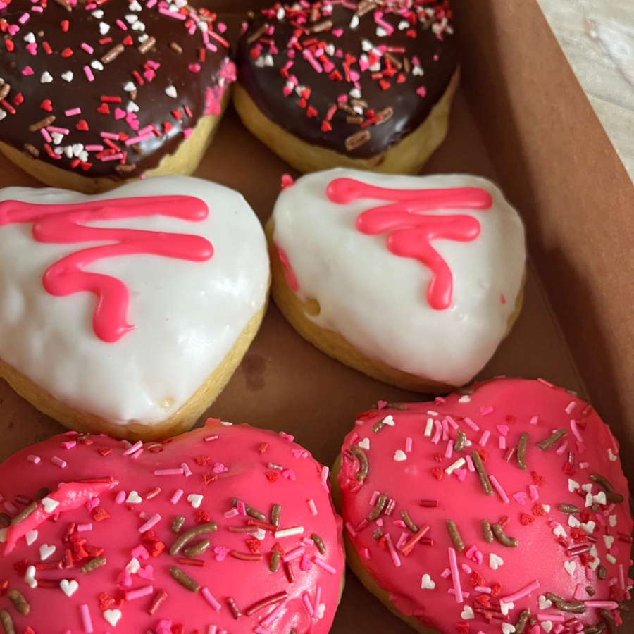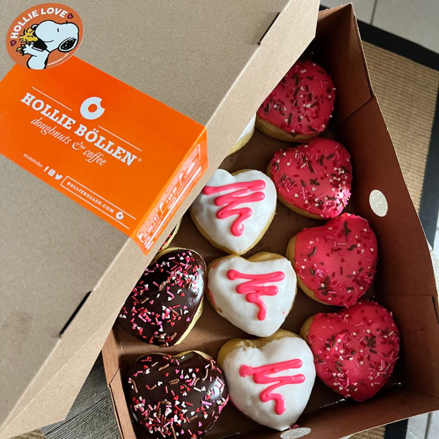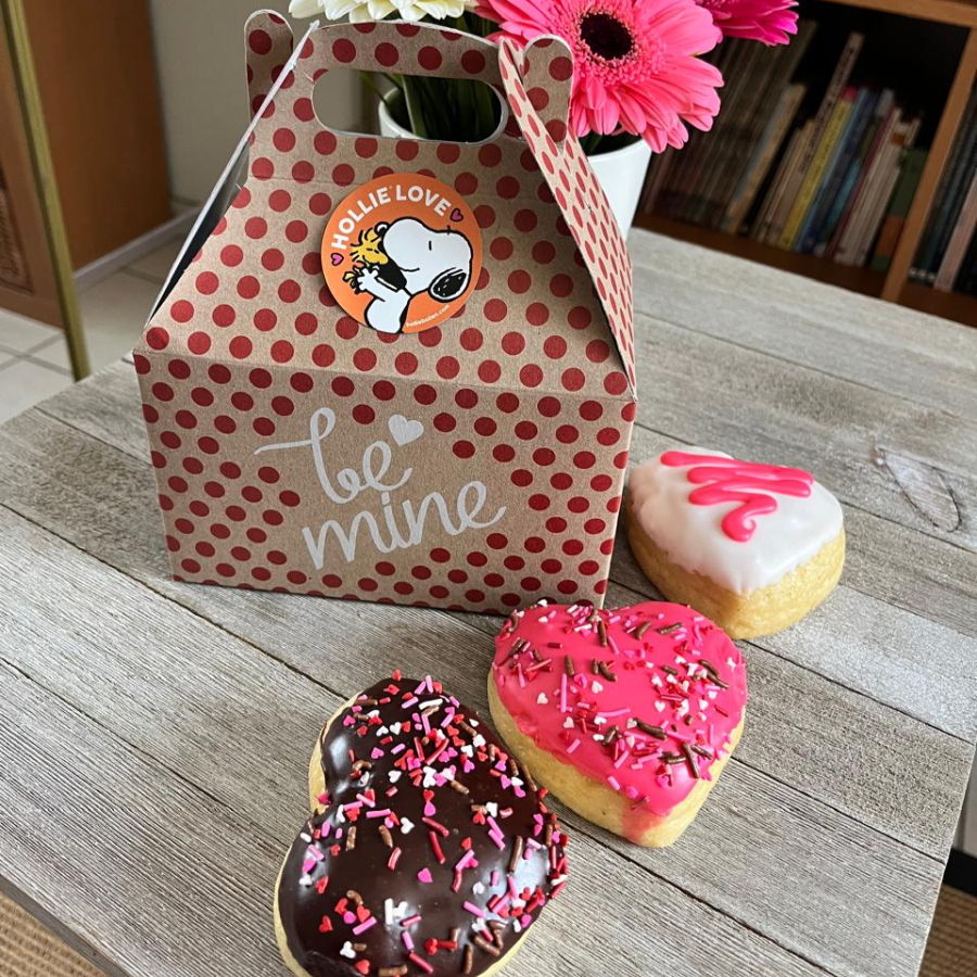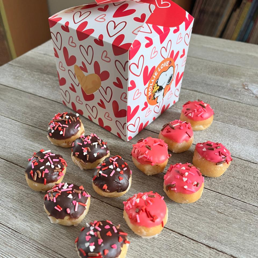 Seis donas HollieLOVE en forma de corazón, en sabores: vainilla, fresa y chocolate con sprinkles de San Valentín.