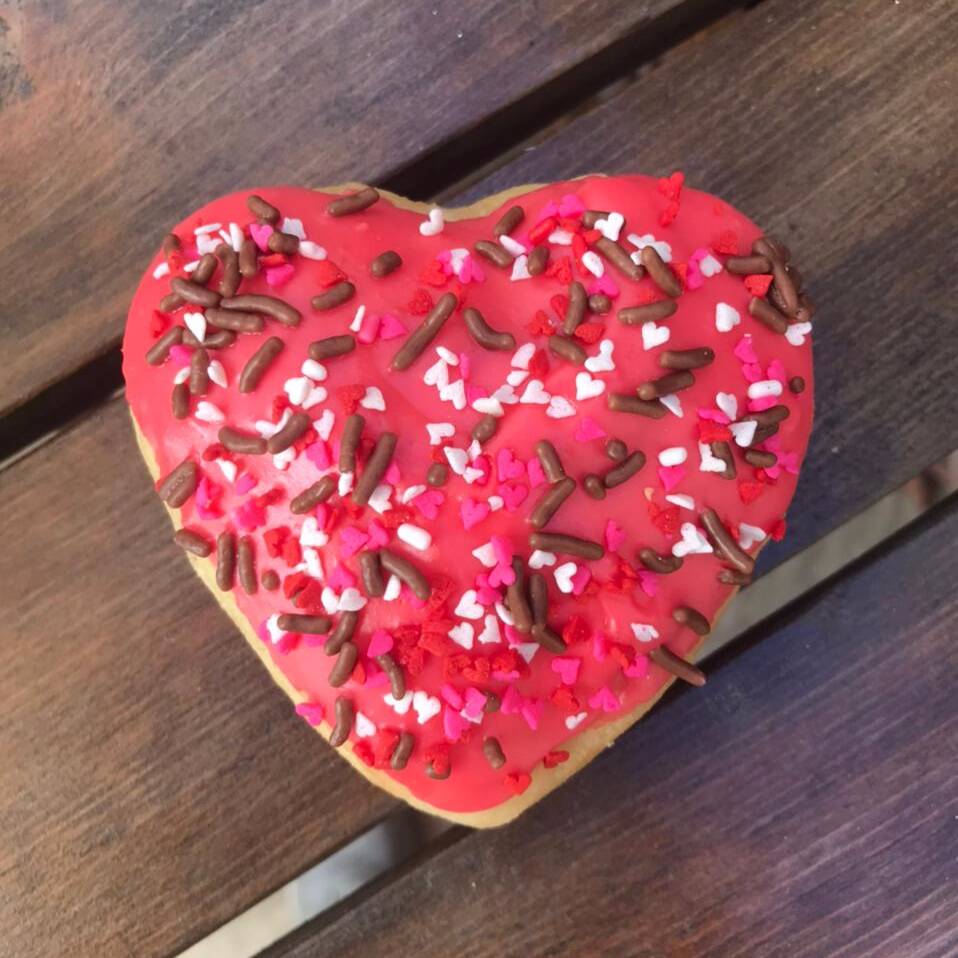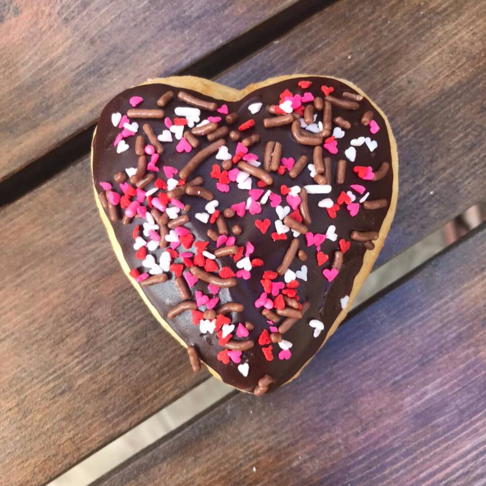 Hollieböllen LOVE en forma de corazón, recién elaborada, con cobertura de chocolate y chispitas de San Valentín. Suavecita que se deshace en tu boca :)
