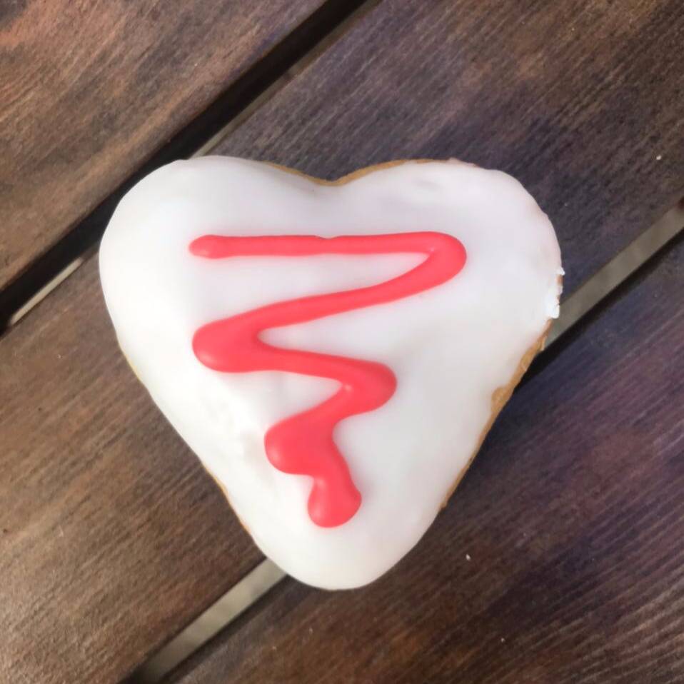 Hollieböllen LOVE en forma de corazón, recién elaborada, con cobertura de vainilla con trazos sabor fresa. Suavecita que se deshace en tu boca :)