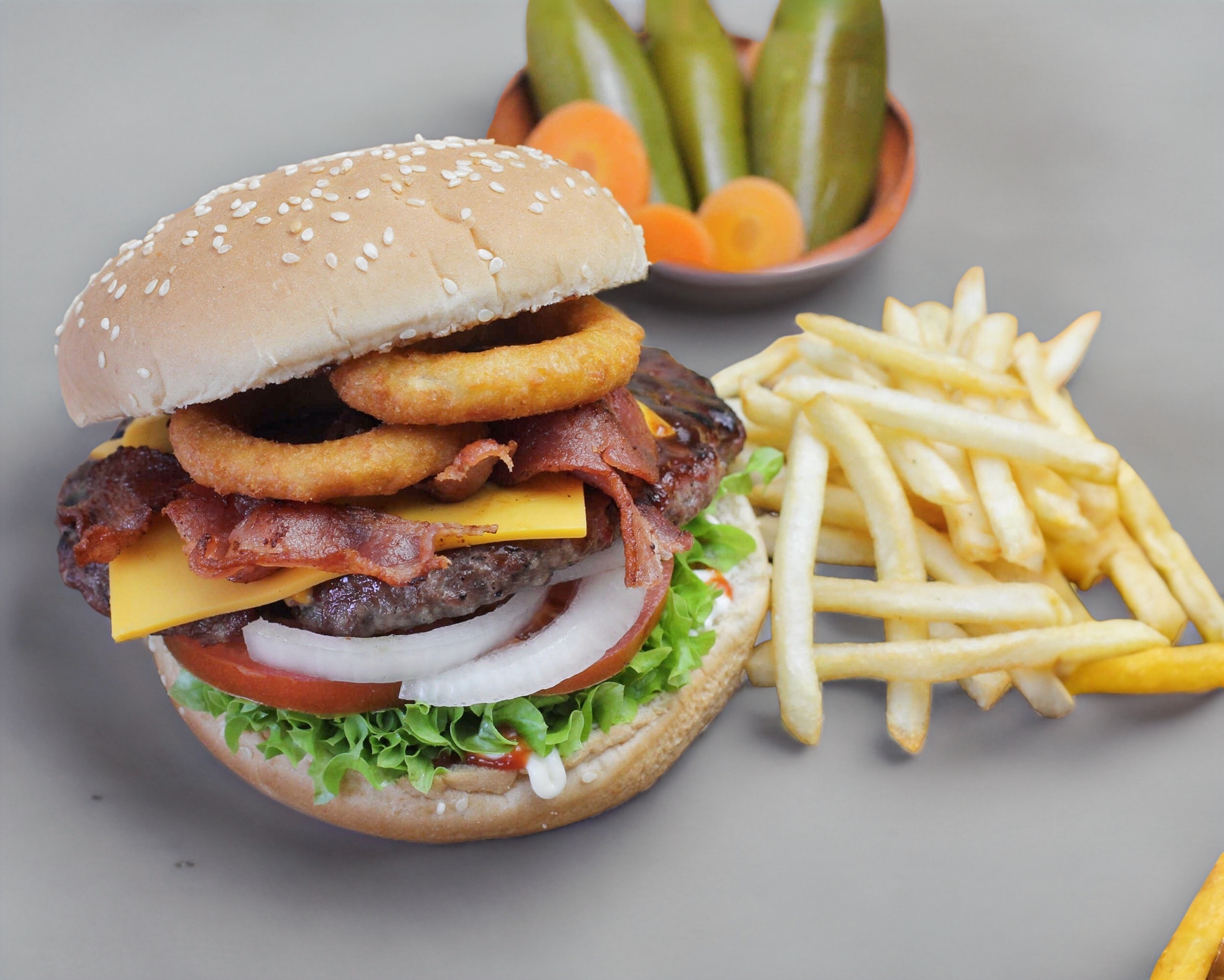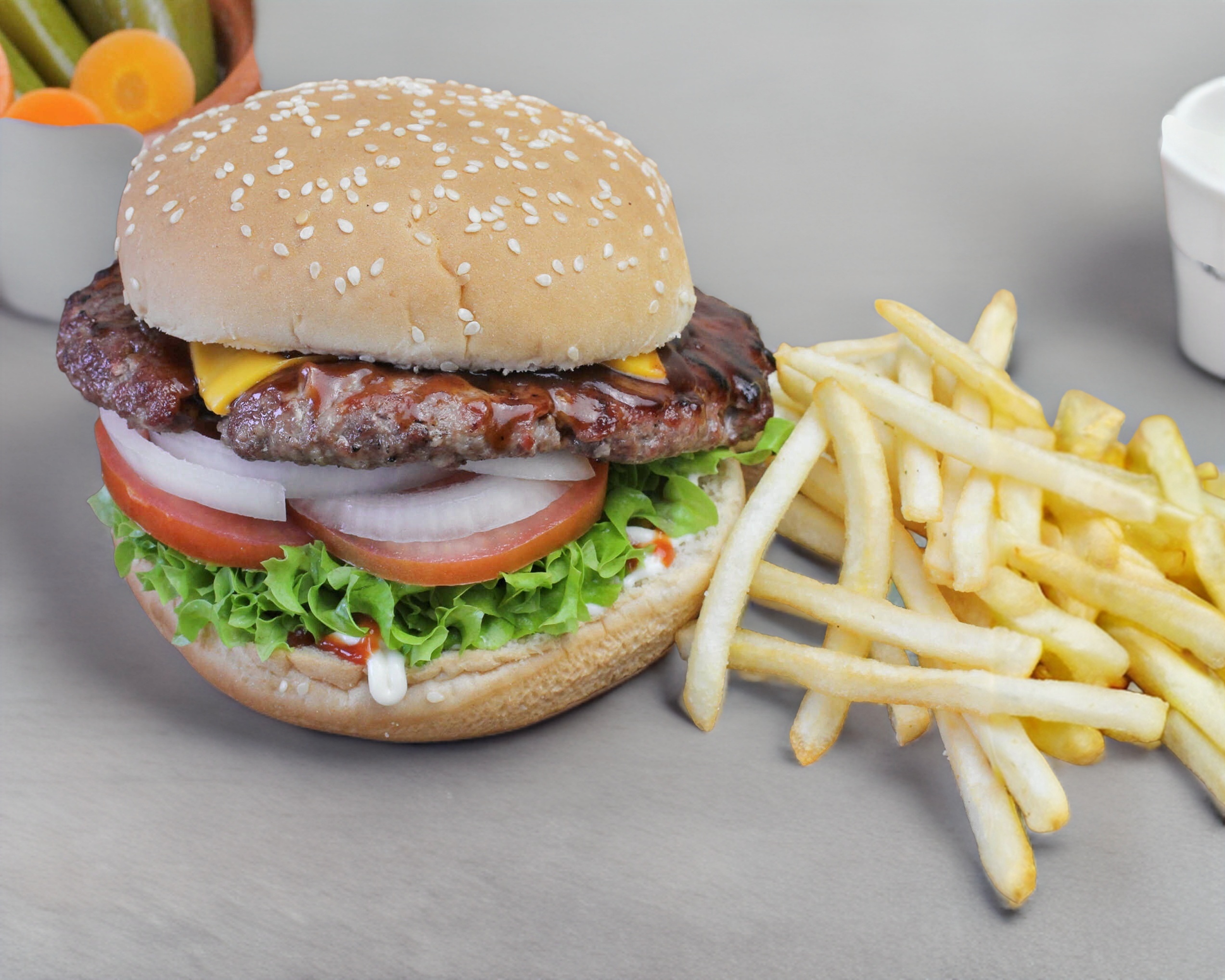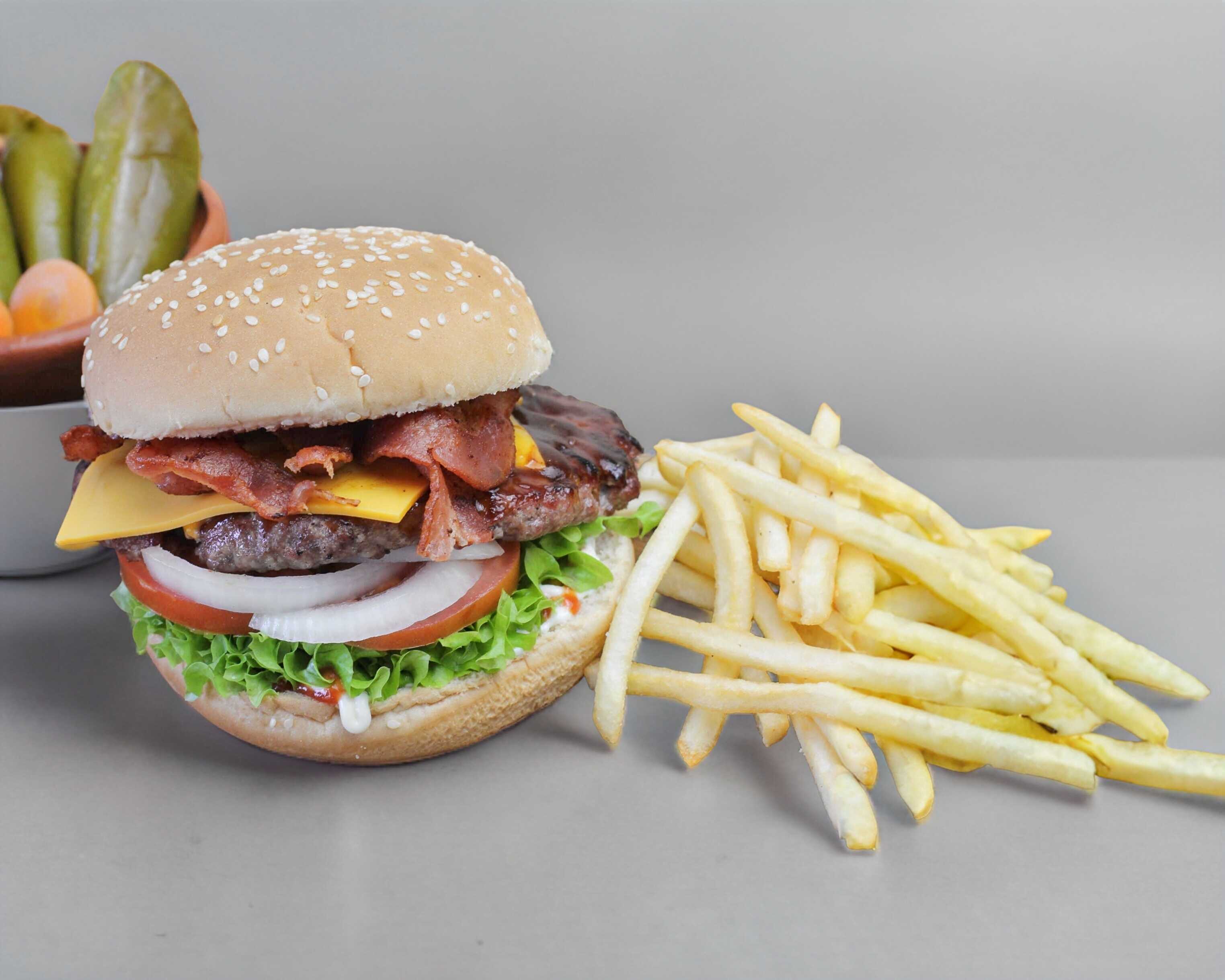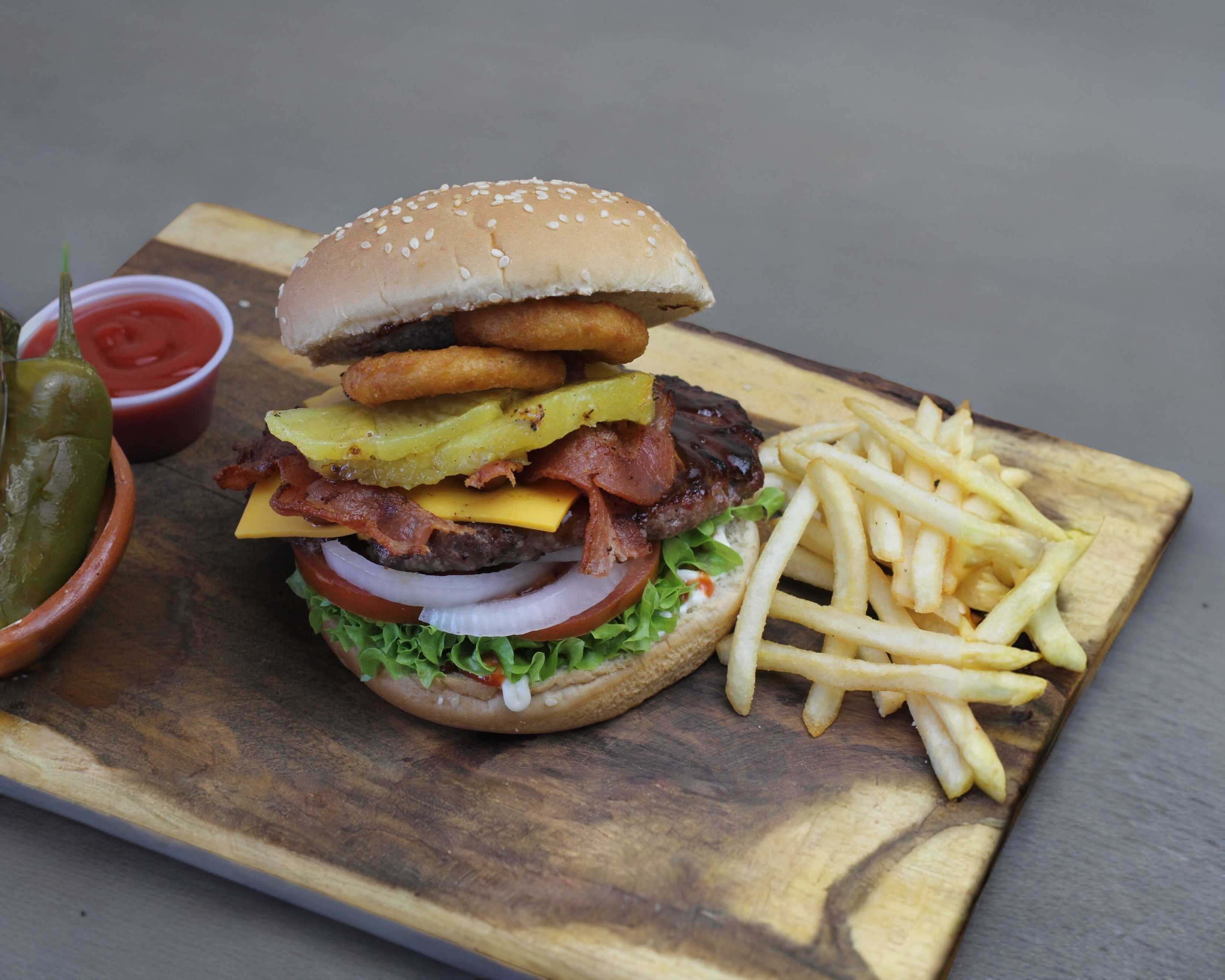 100% Carne de res preparada diariamente. Incluye papas, Queso Americano, Aros de cebolla, Tocino, Tomate, Cebolla, Lechuga, Catsup, Bbq, Mayonesa, Mostaza.