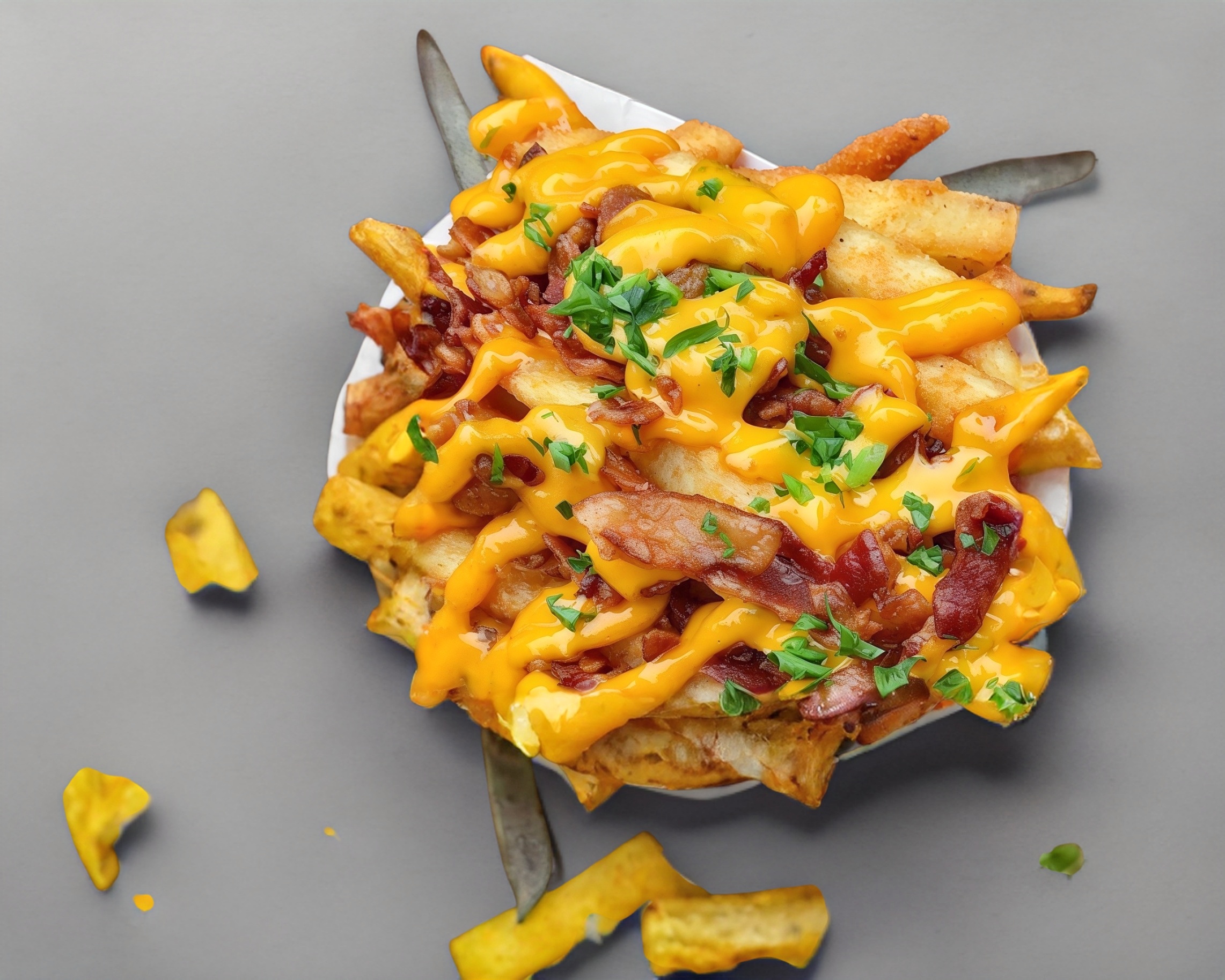 Orden de papas fritas con tocino y queso para nachos.