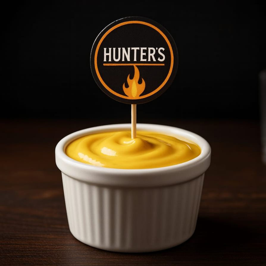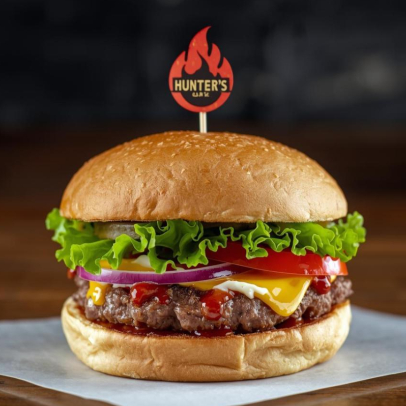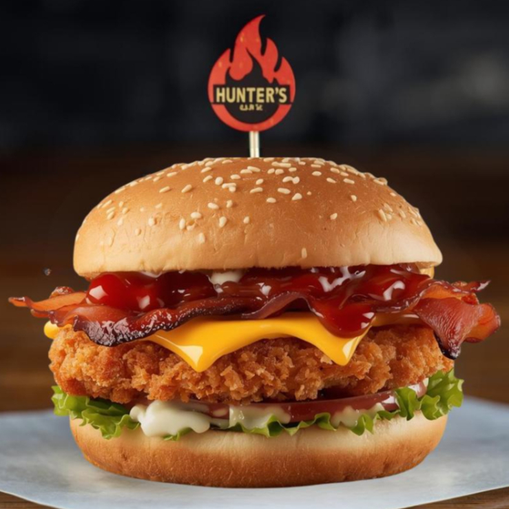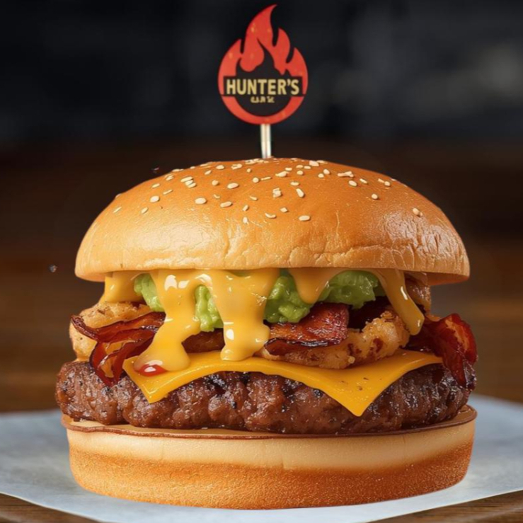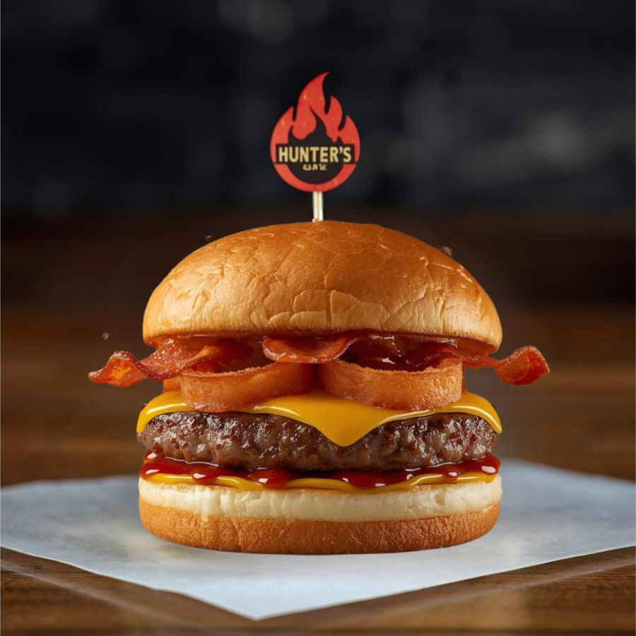 160 gr de carne de res preparada por nosotros!, queso amarillo, tiras de tocino, Aros de cebolla, Salsa BBQ Hunter's, Pan Brioche y Aderezos!