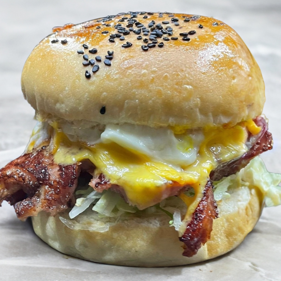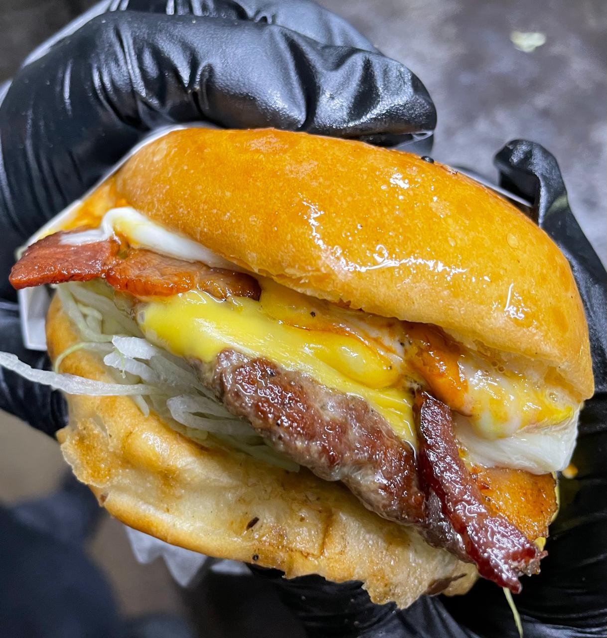 Carne de res, pan casero del día, tocino, queso Oaxaca, queso amarillo, cebolla caramelizada, jalapeños sazonados, lechuga, tomate y aderezos.