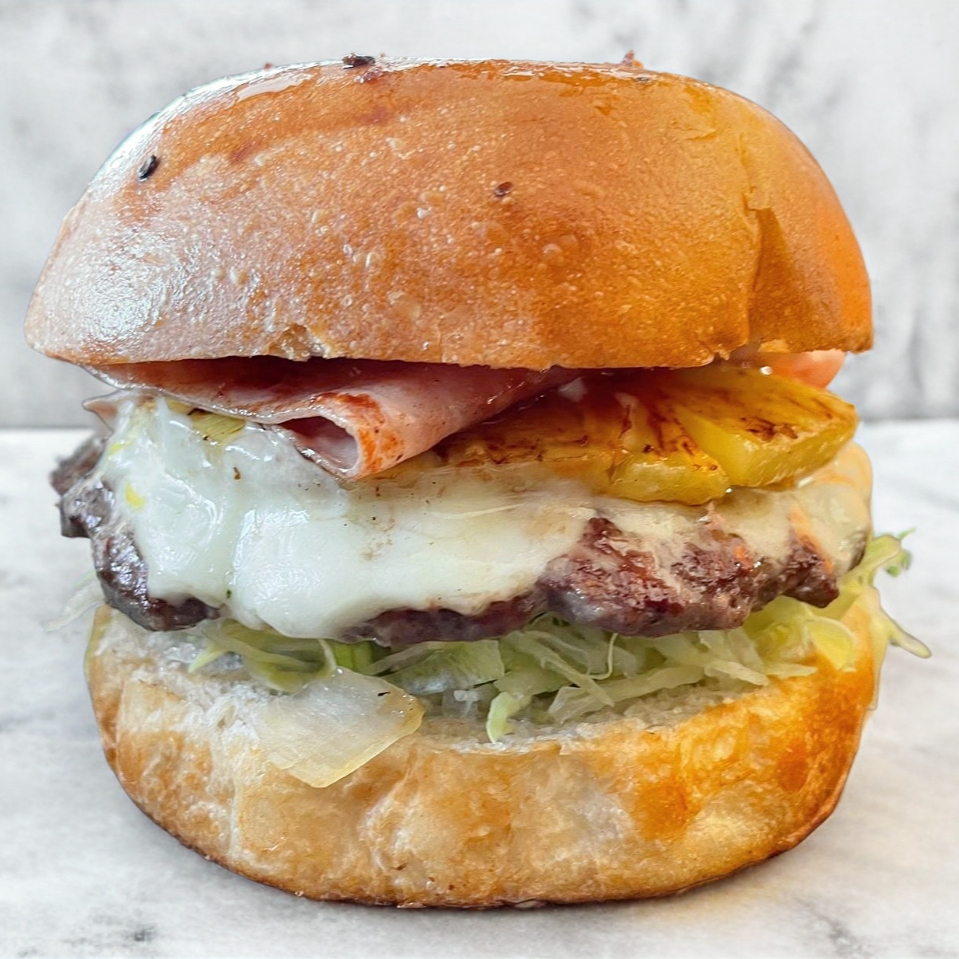 Carne de res, pan casero del día, queso blanco, jamón, piña, cebolla, jalapeños sazonados, lechuga, tomate y aderezos.