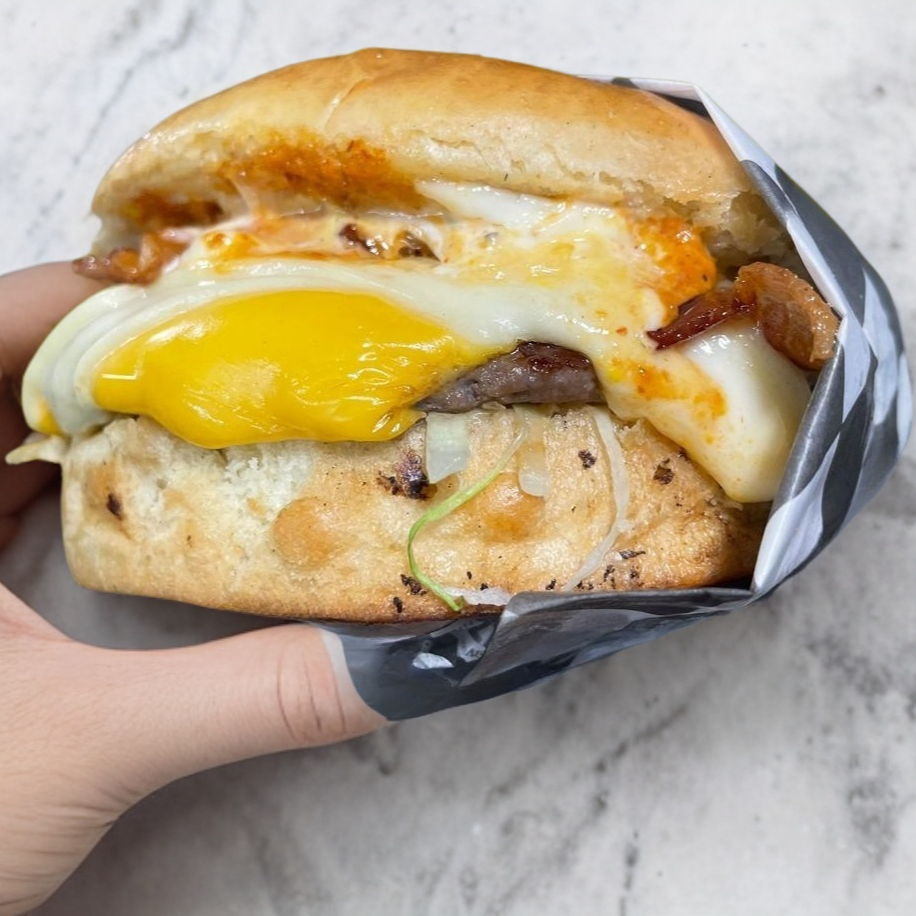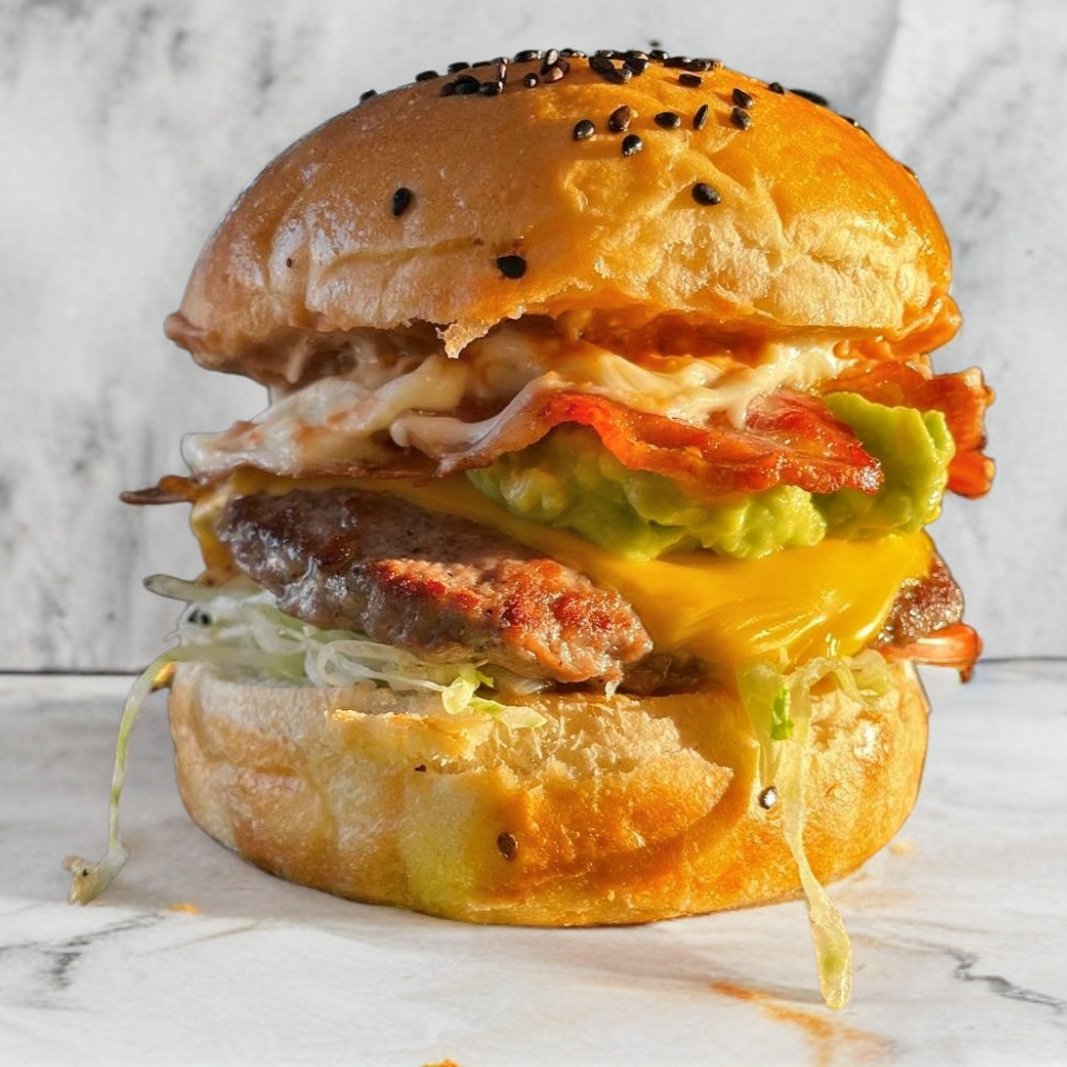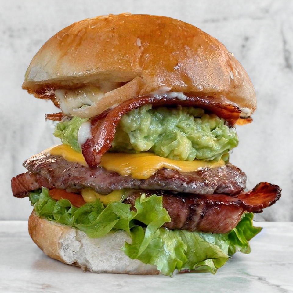 Carne de res, pan casero del día, tocino, queso Oaxaca, queso amarillo, queso blanco, cebolla caramelizada, jalapeños sazonados, lechuga, tomate y aderezos.