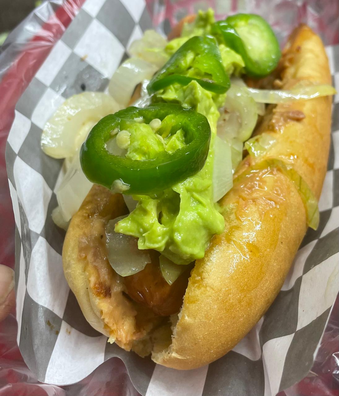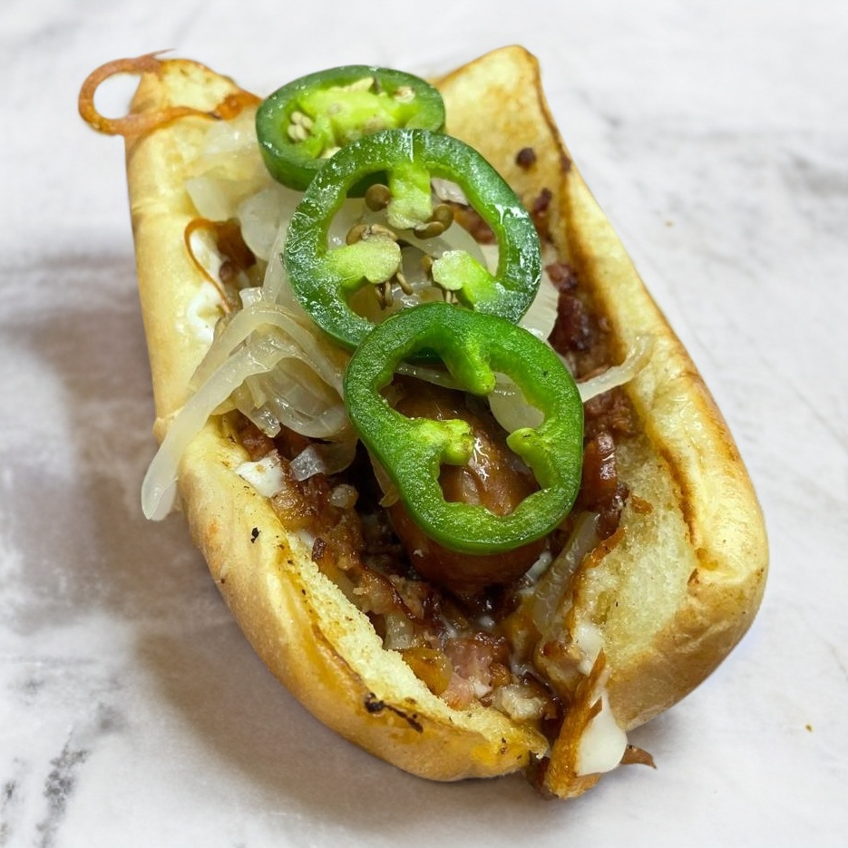 Salchicha de pavo, tocino, queso Oaxaca, cebolla caramelizada, jalapeños sazonados.