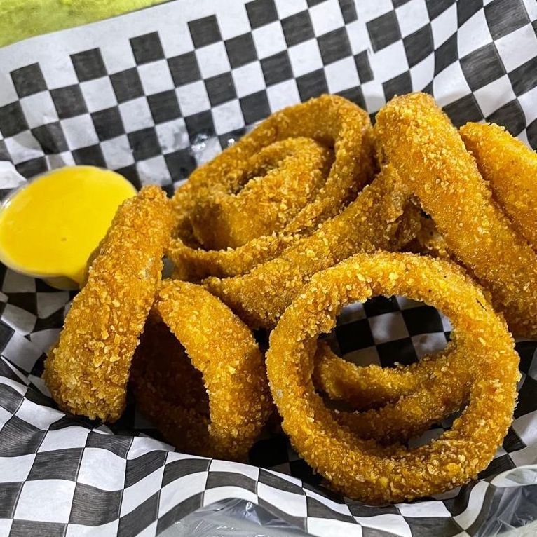 carne de res, pan casero del dia, queso americano, tocino, aros de cebolla de la casa, BBQ, aderezo jalapeño de la casa