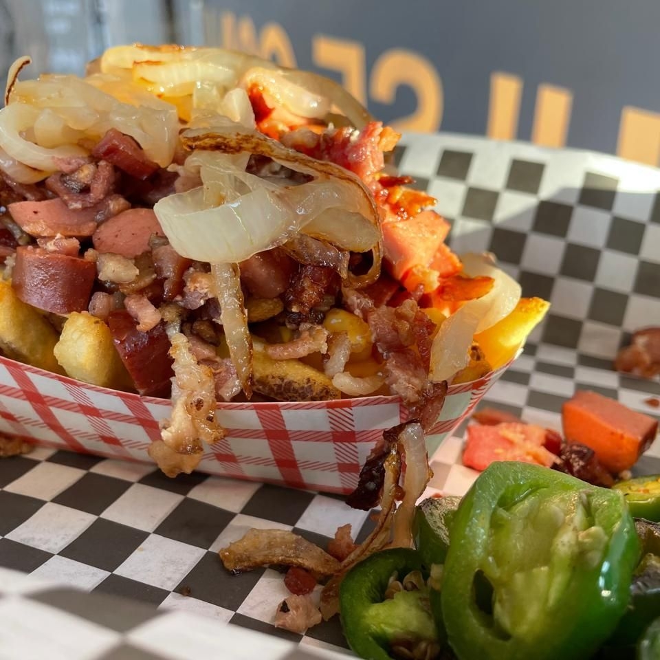 nuestras ricas papas fritas acompañadas con salchicha, tocino, queso de nachos, aderezo chipotle, cebolla asada y jalapeños asados