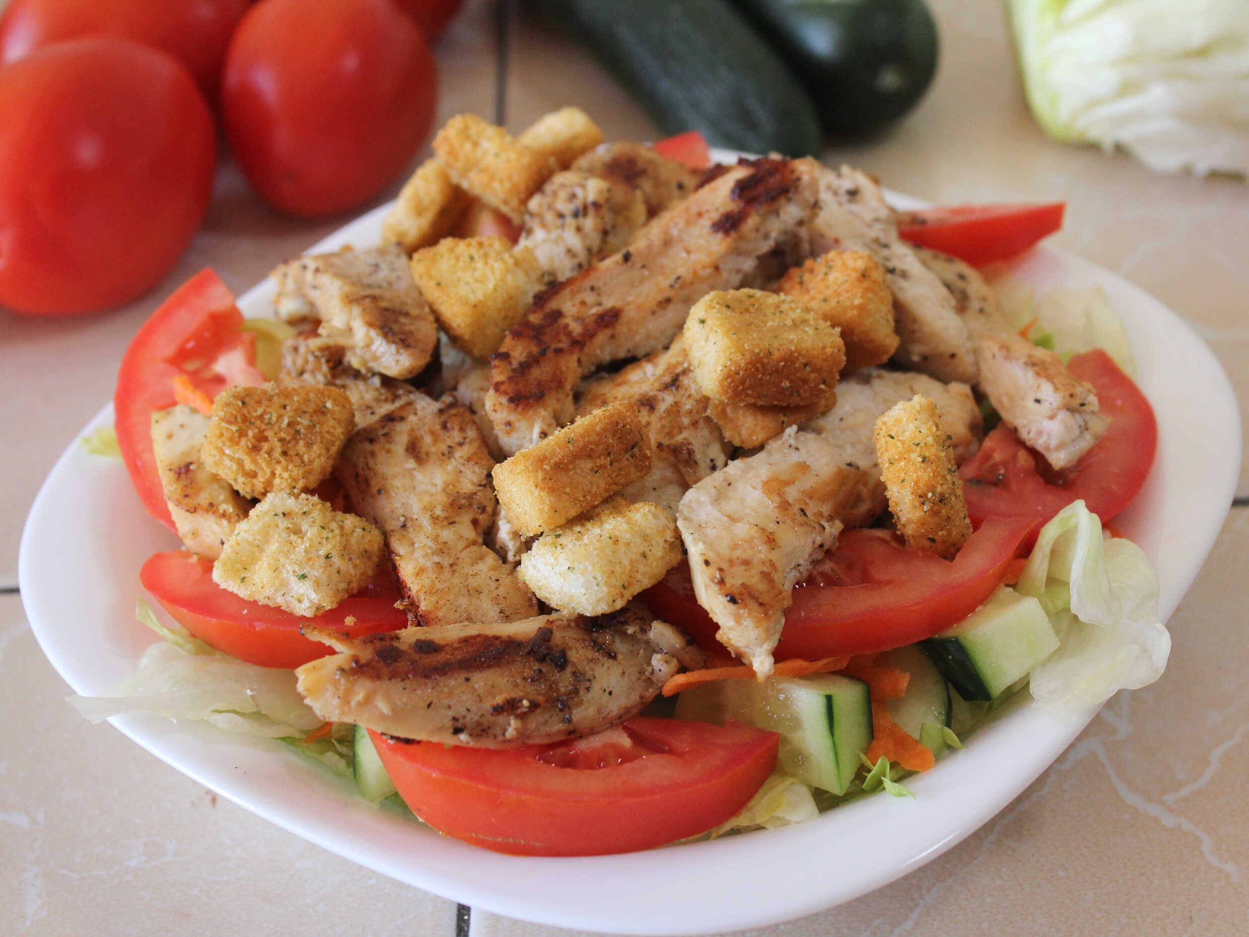 Preparada con lechuga, pepino, tomate y zanahoria rallada. Incluye aderezo y crotones.