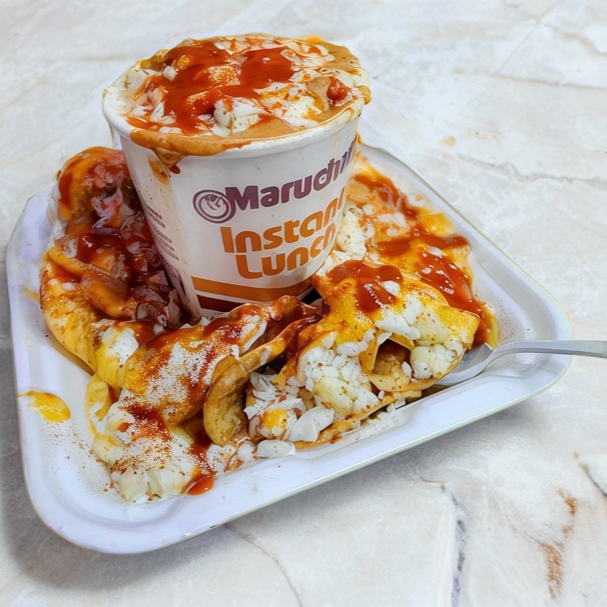 Maruchan preparada con elote , mayonesa,mantequilla, limón, queso de nacho ,queso cotija,chile