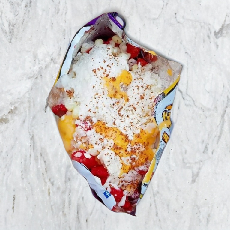 Sabritas,Elote , queso de nacho , mayonesa, mantequilla, limón queso cotija y tajin
