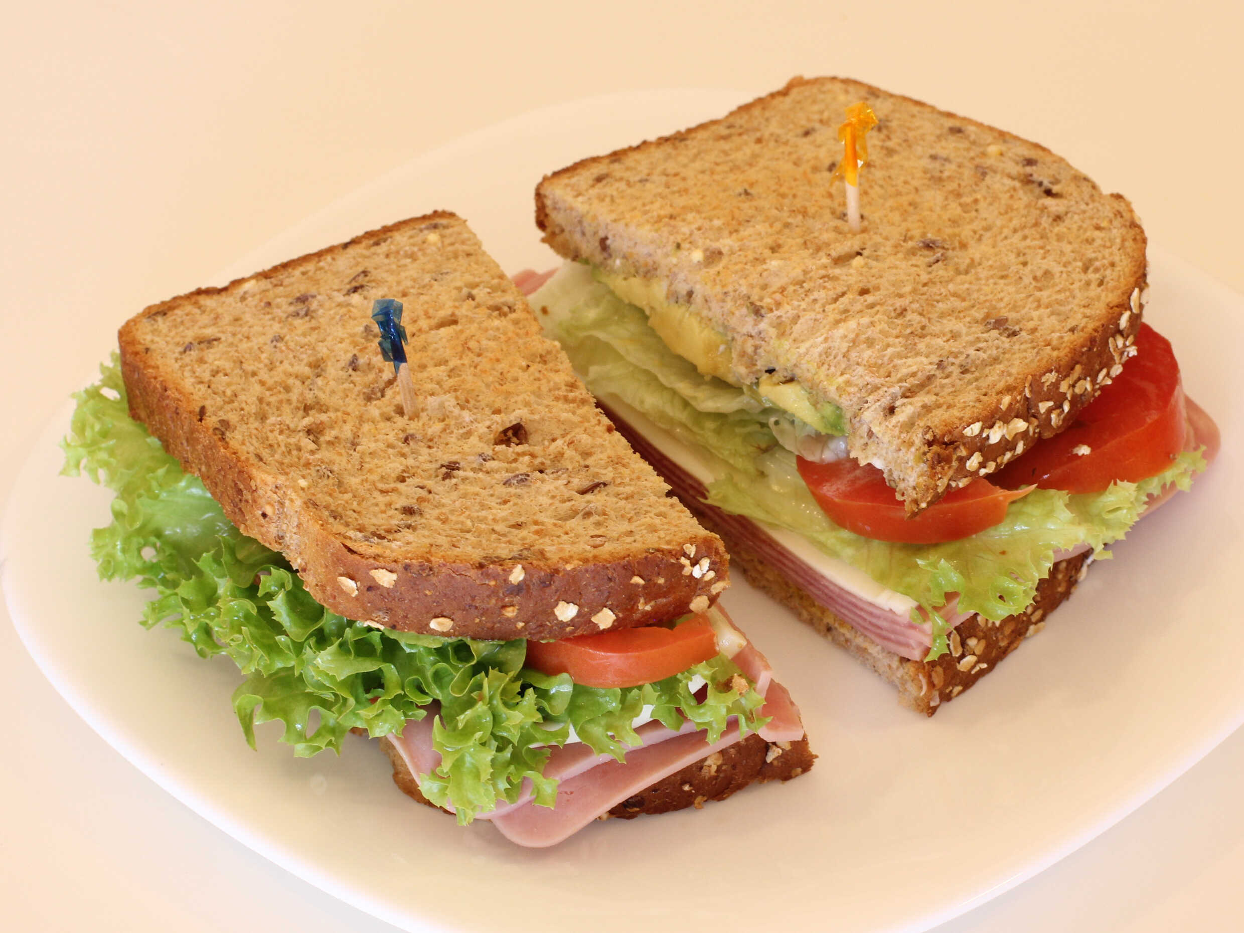 Pan 12 granos, mayonesa, mostaza, 2 rebanadas de jamón, queso, tomate, aguacate, lechuga y chiles jalapeños.