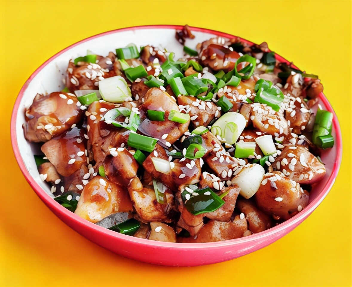 Pollo en la plancha con salsa siriasha, cebollines y ajonjoli