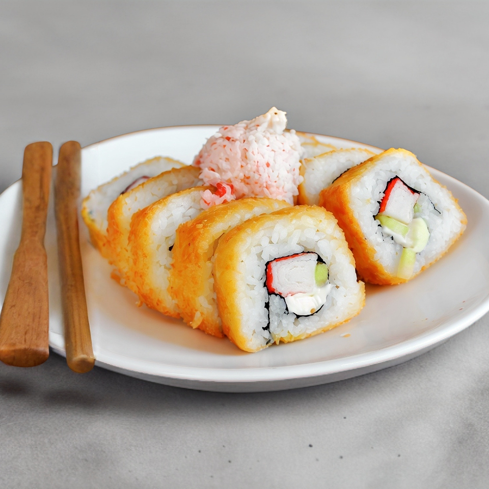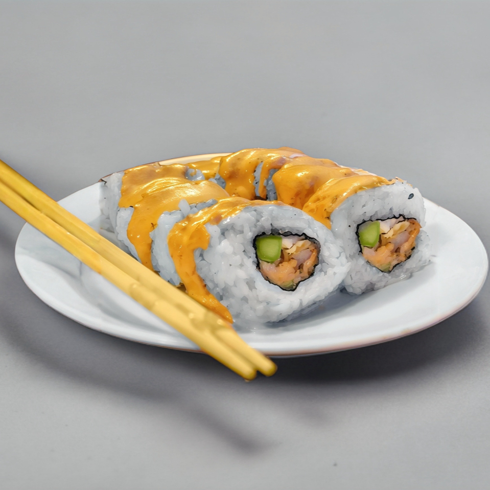 Queso, aguacate, camarón empanizado, bañado en salsa chipotle con ajonjolí