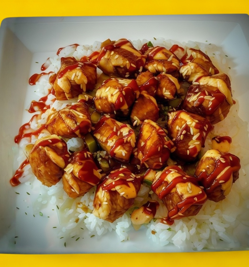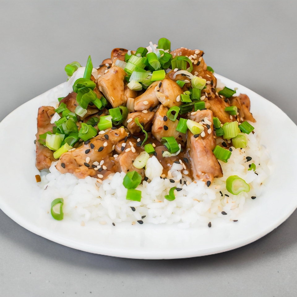cama de arroz, pollo en la plancha, salsa dulce y cebollines