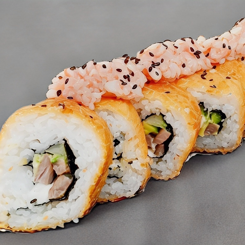 Camarón empanizado, aguacate, forrado de queso con tampico encima y ajonjolí